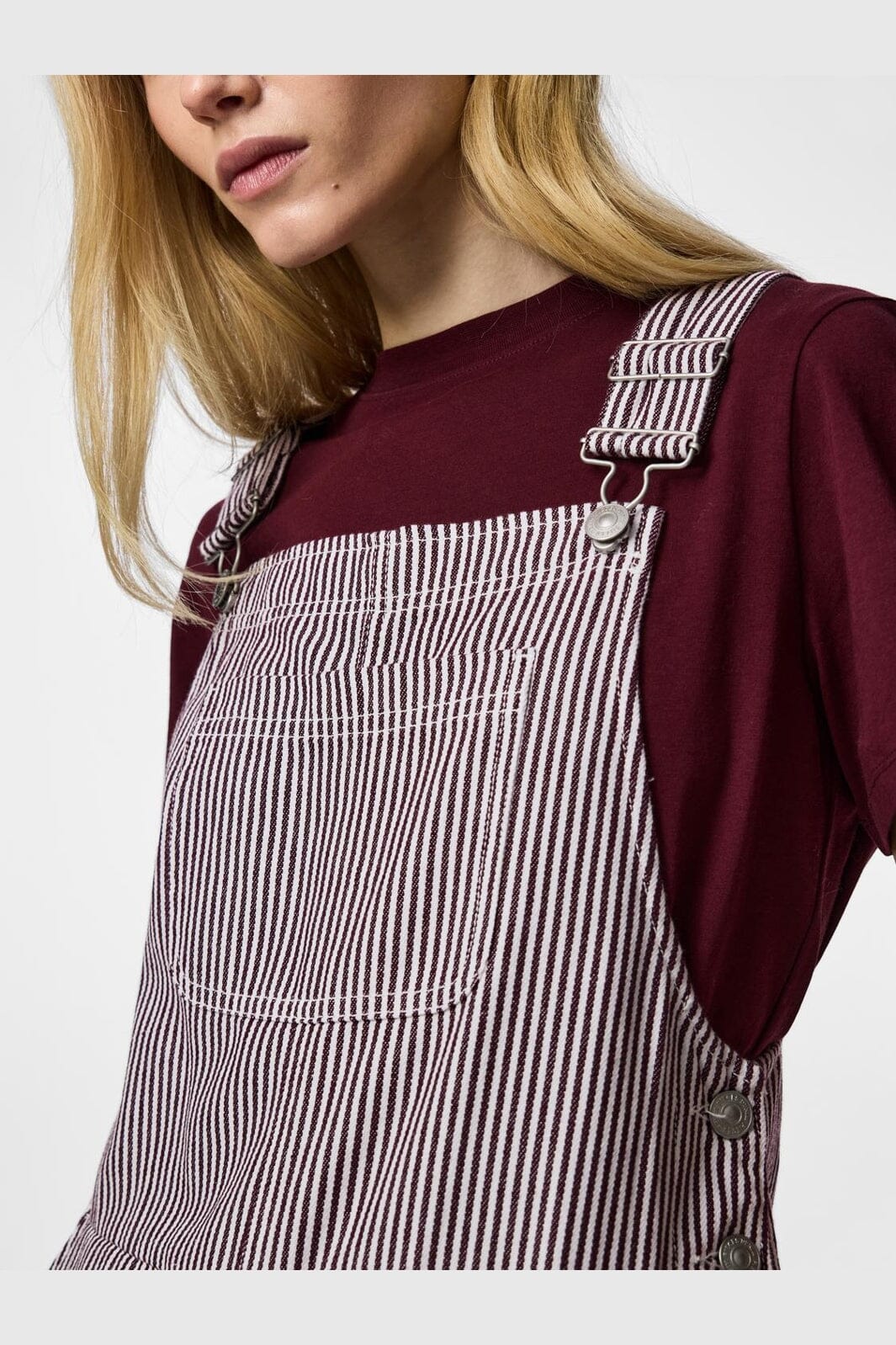 Gestreifte Latzhose von Pieces in Bordeaux, Rot und Weiß. Hergestellt aus 55 % Baumwolle und 45 % Polyester mit einer lockeren Passform und bodenlanger Länge.