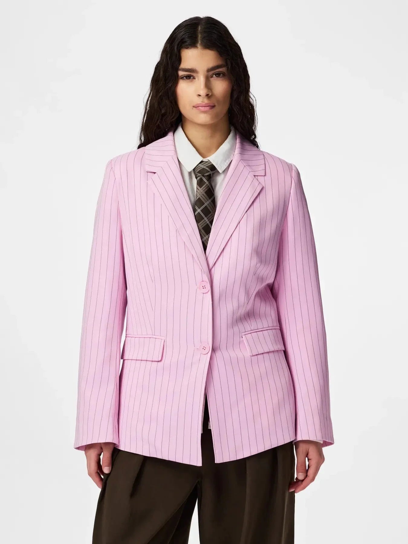 Rosa Blazer von Pieces mit dünnen rosa Streifen auf der gesamten Oberfläche. Hergestellt aus Polyester mit Elasthan und einer seidenähnlichen Oberfläche.