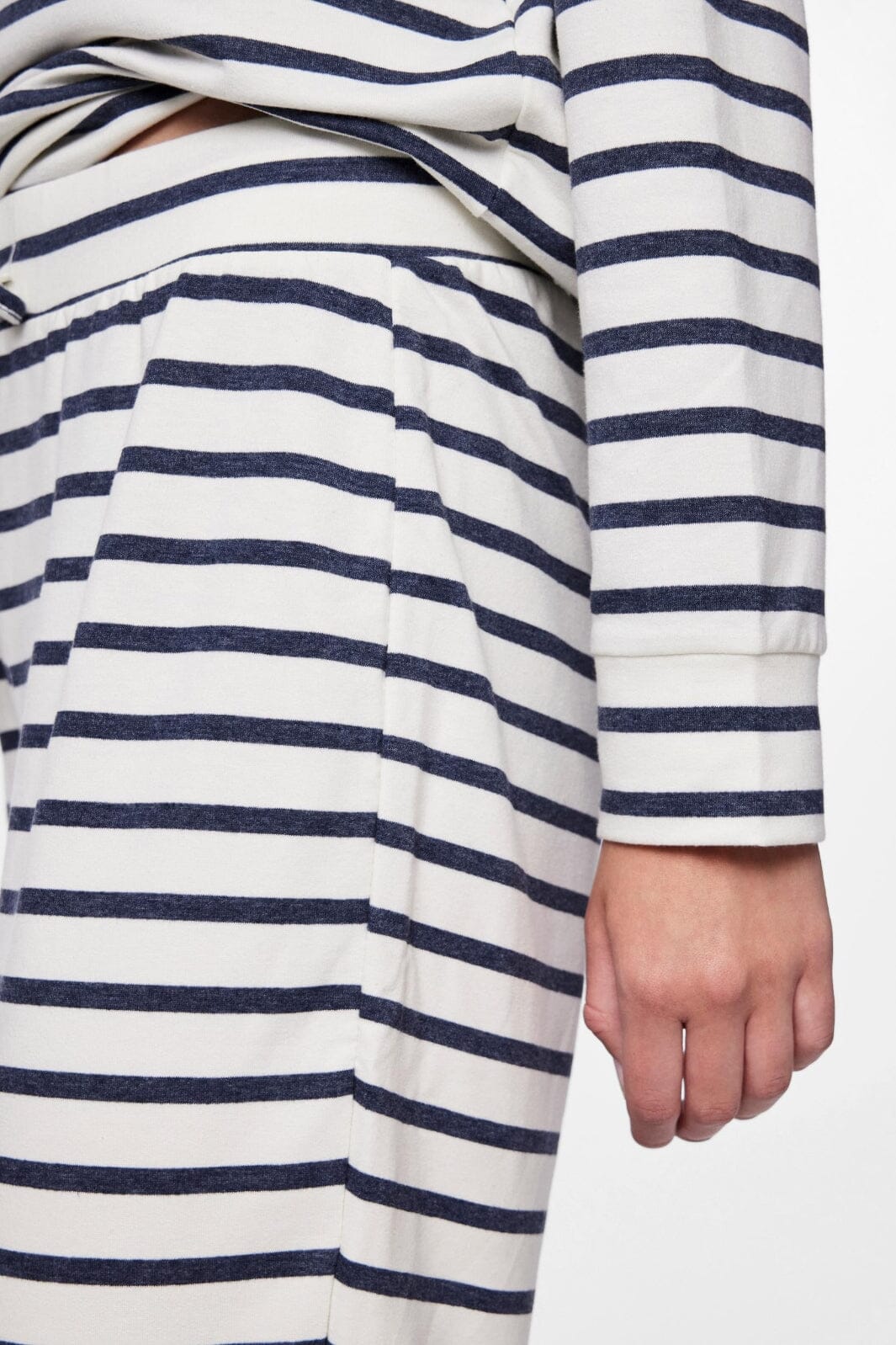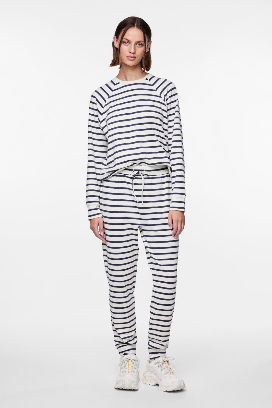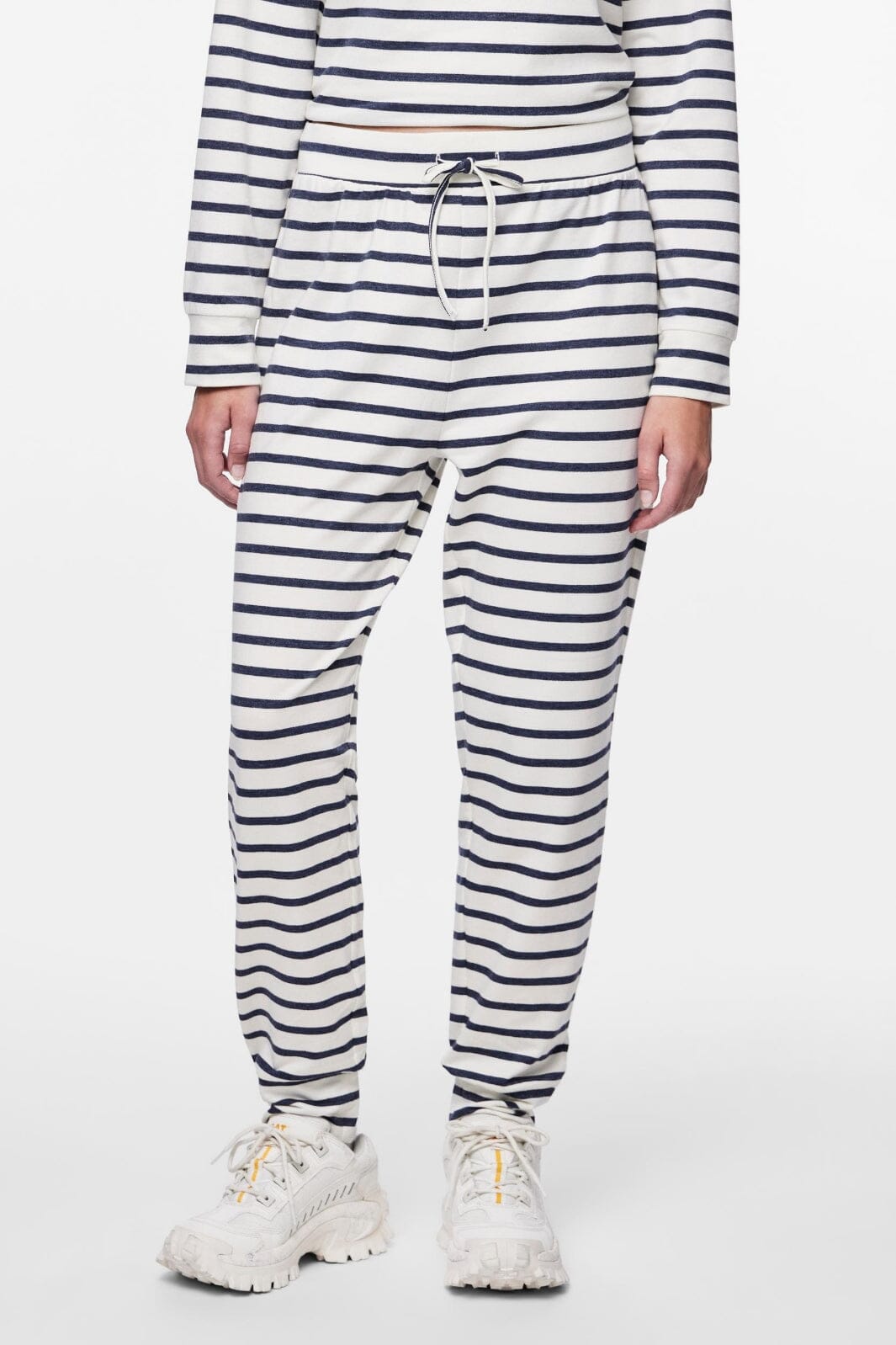 Gestreifte Hosen von Pieces in Marineblau und Weiß. Die Hosen haben einen elastischen Bund mit Kordelzug und enden an den Knöcheln. Sie bestehen aus einer Mischung aus Baumwolle und Polyester mit Stretch.