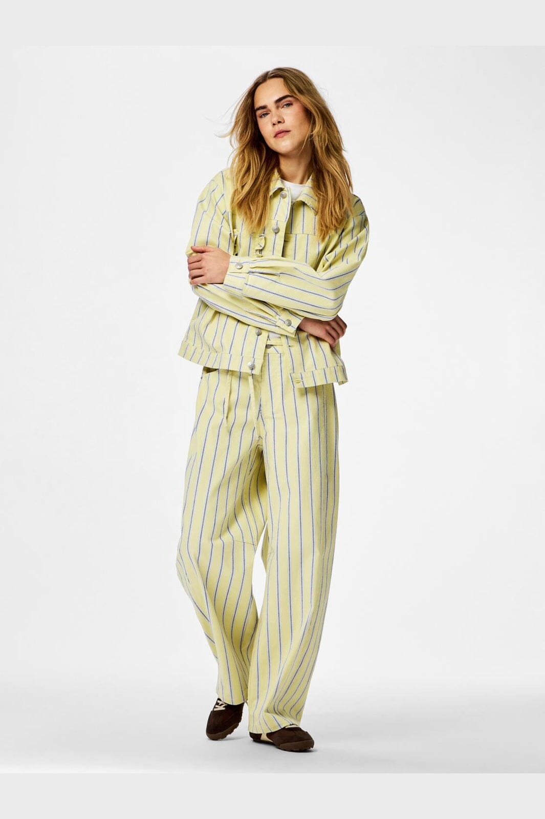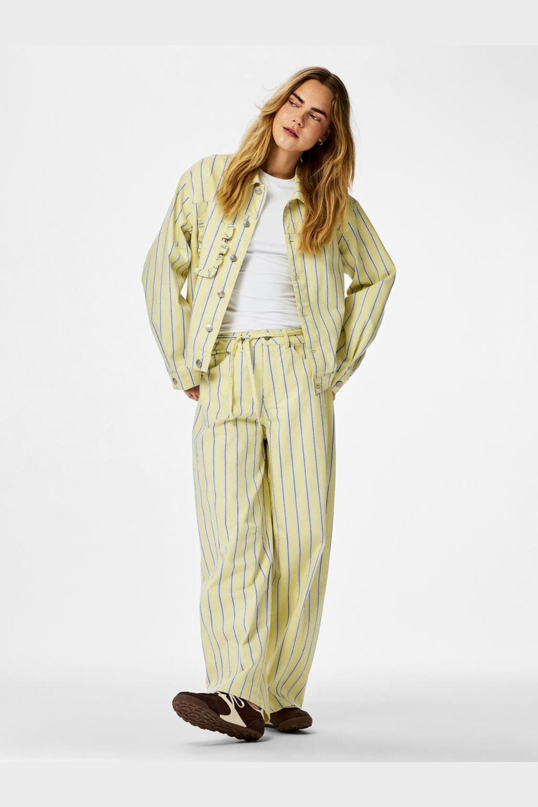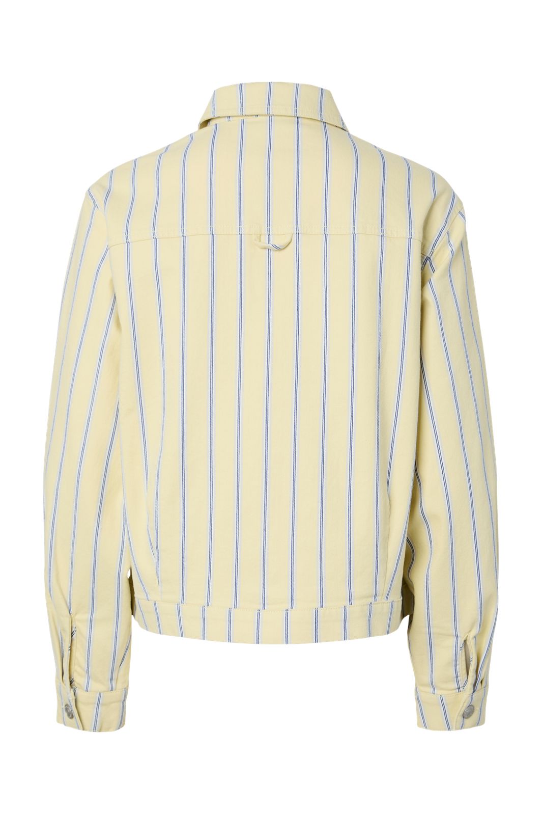 Jeansjacke von Pieces in Hellgelb mit vertikalen blauen Streifen. Die Jacke hat eine lockere Passform und einen klassischen Hemdkragen.