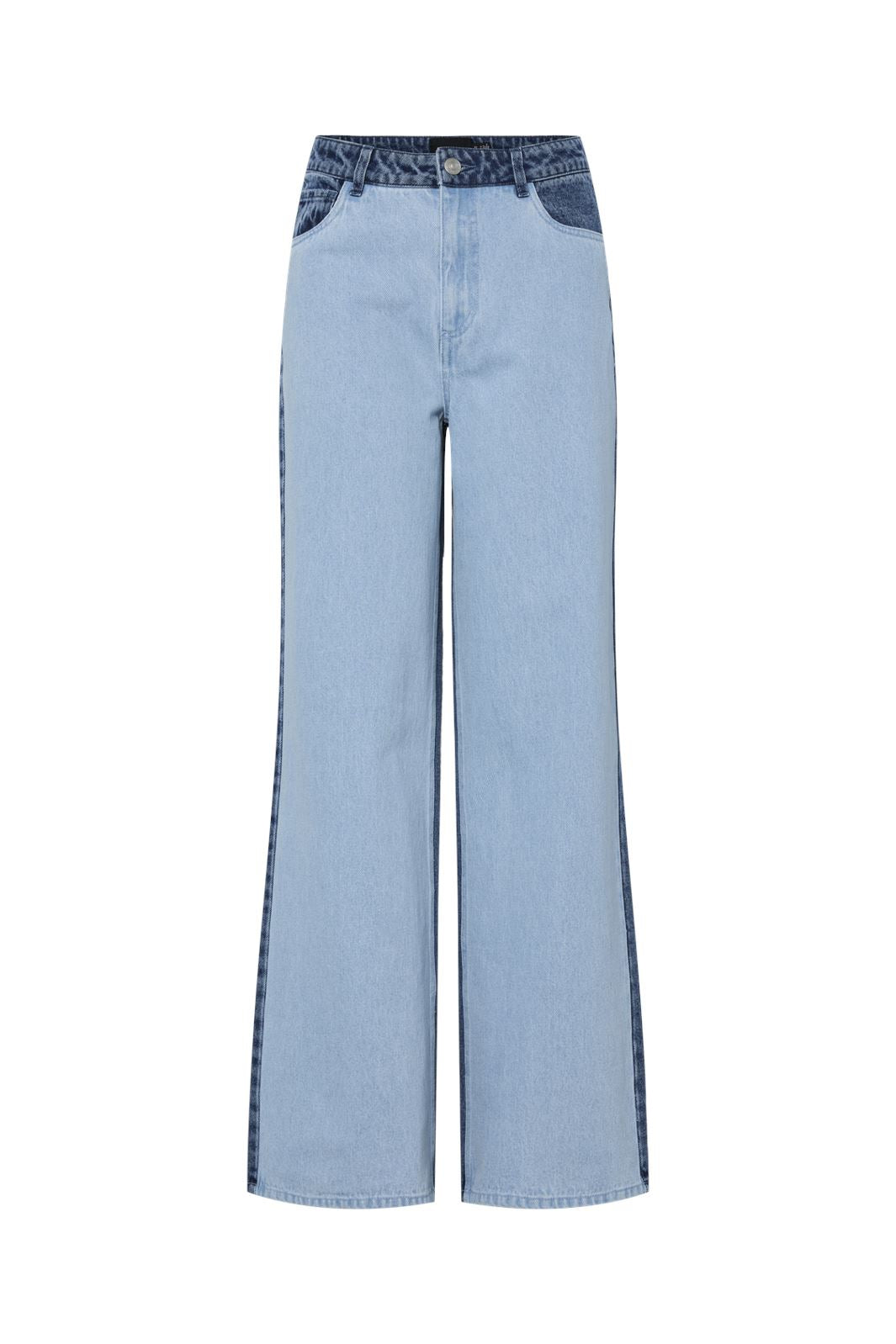 Breite Jeans von Pieces mit einem charakteristischen Farbblockdesign in hellblauem und mittelblauem Denim. Die hohe Taille und die weiten Beine schaffen eine lässige Silhouette.