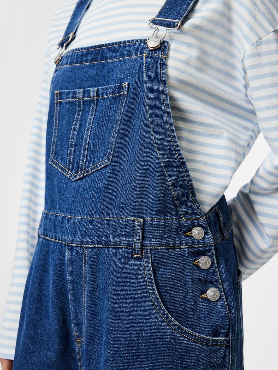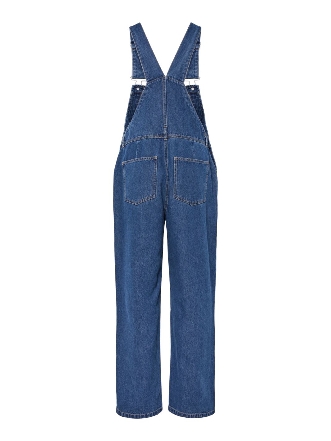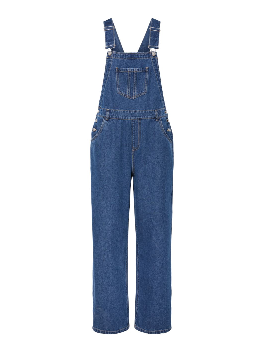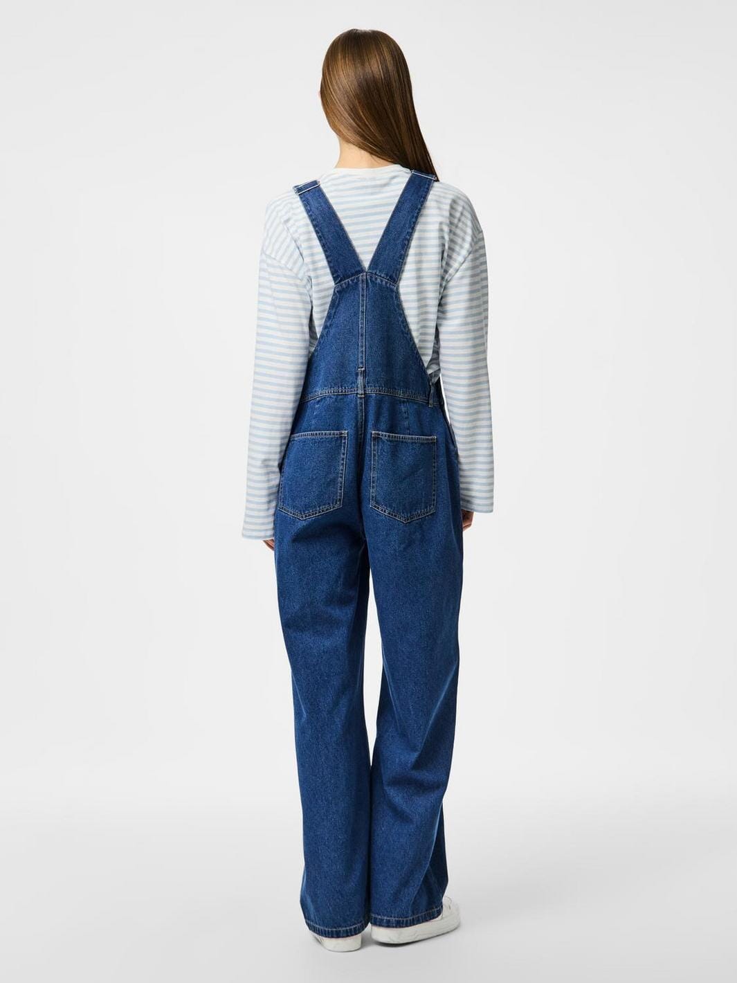 Denim-Overall von Pieces aus dunkelblauem Denim mit starkem Baumwollanteil. Die Overall hat eine lockere Passform mit Schnallenverschluss und praktischen Taschen sowohl vorne als auch hinten.