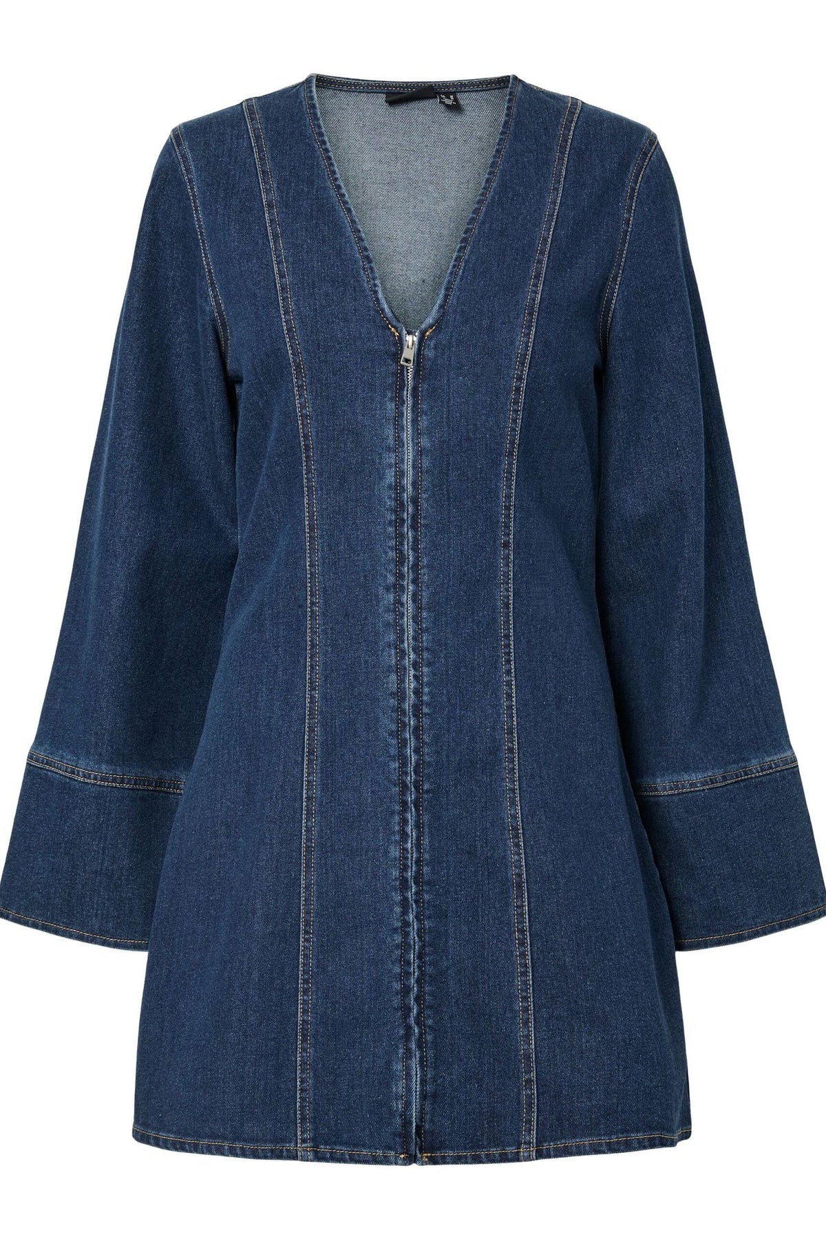 Jeanskleid von Pieces in dunkelblauem Denim mit langen Ärmeln und rundem Halsausschnitt. Das Kleid hat eine normale Passform und reicht bis zur Mitte des Oberschenkels. Die dekorativen Nähte verleihen dem Kleid einen rustikalen Look.