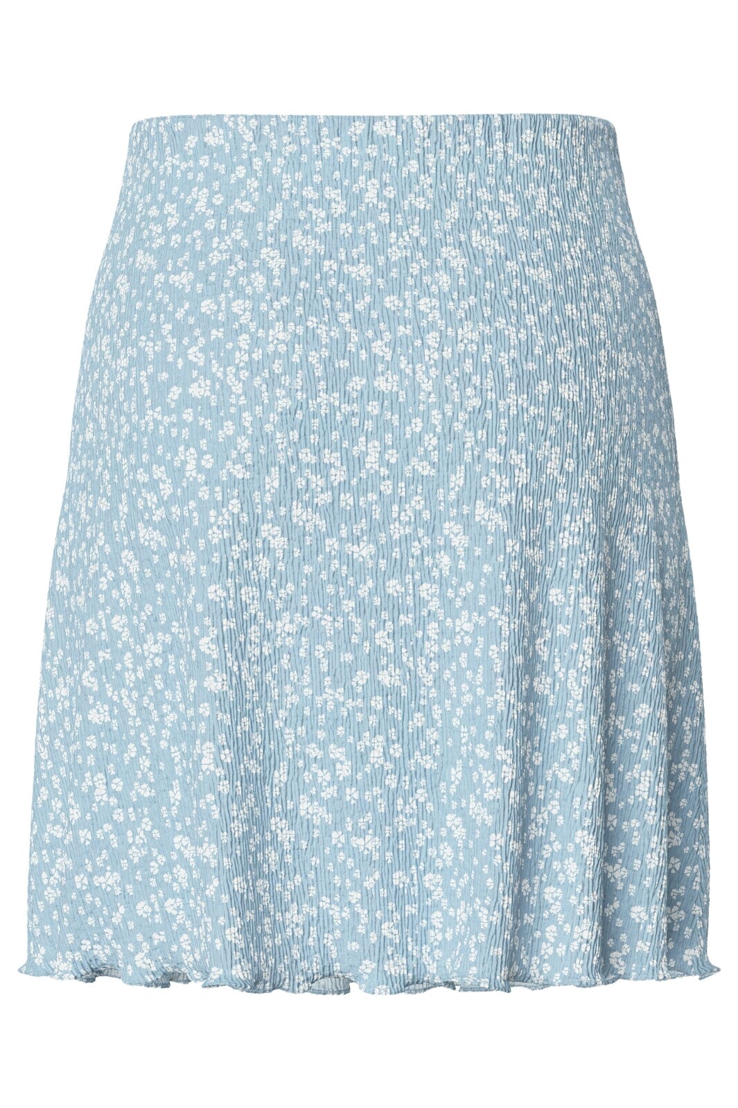 Kurzer Rock von Pieces in Hellblau mit kleinen weißen Blumen. Der Rock hat einen plissierten Stoff mit Volantkante und eine hohe Taille mit elastischem Bund, der gute Bewegungsfreiheit bietet.