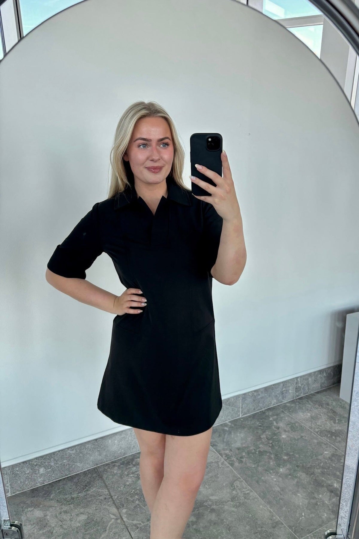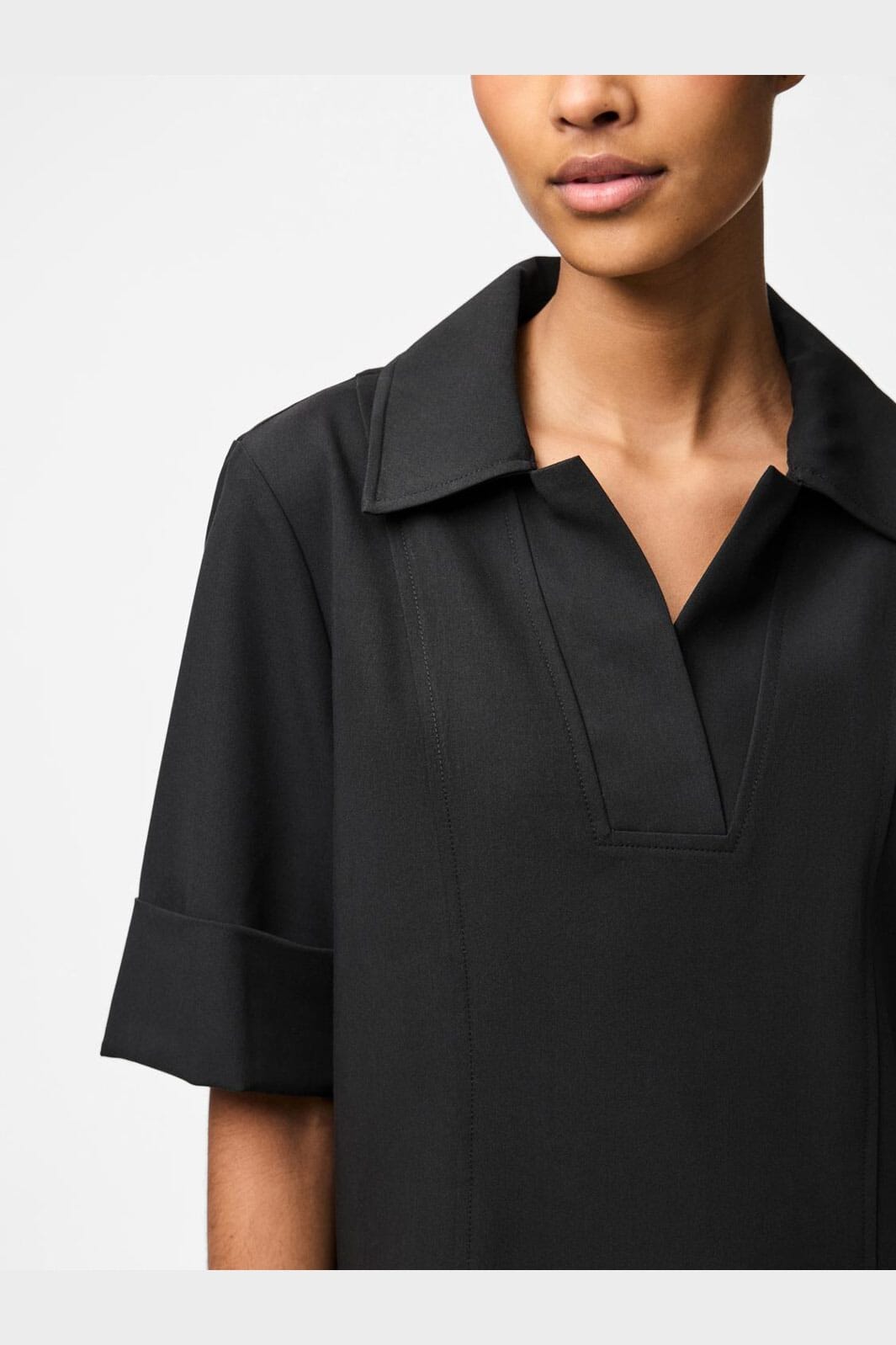 Schwarzes Kleid von Pieces aus Twill mit hohem Garnanteil. Das Kleid hat einen V-Ausschnitt und kurze Ärmel mit Manschetten. Es ist ungefüttert und hat eine reguläre Passform.