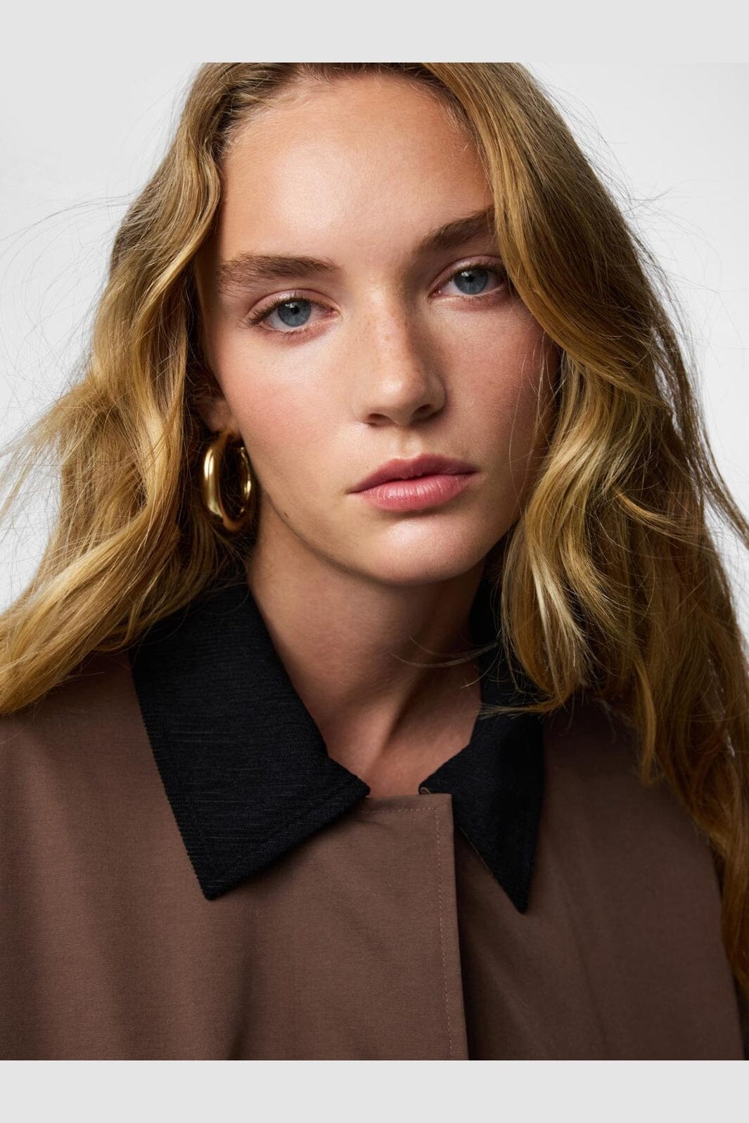 Kurzjacke von Pieces, aus Polyester mit einer seidenähnlichen Oberfläche. Die Jacke ist braun mit einem schwarzen Kragen und schwarzen Manschetten.