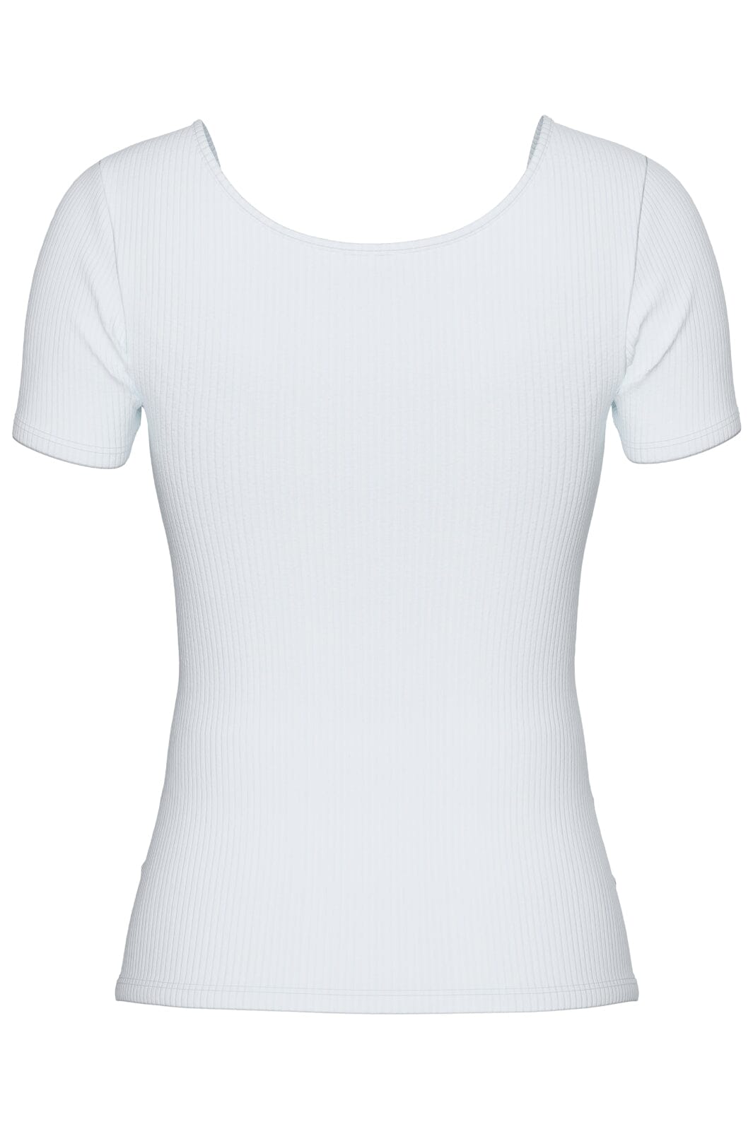 Weiße kurzärmelige Bluse von Pieces mit gerippter Struktur. Die Bluse hat einen runden Halsausschnitt und vier Knöpfe vorne. Die figurbetonte Passform und das weiche Material machen sie einfach zu stylen.