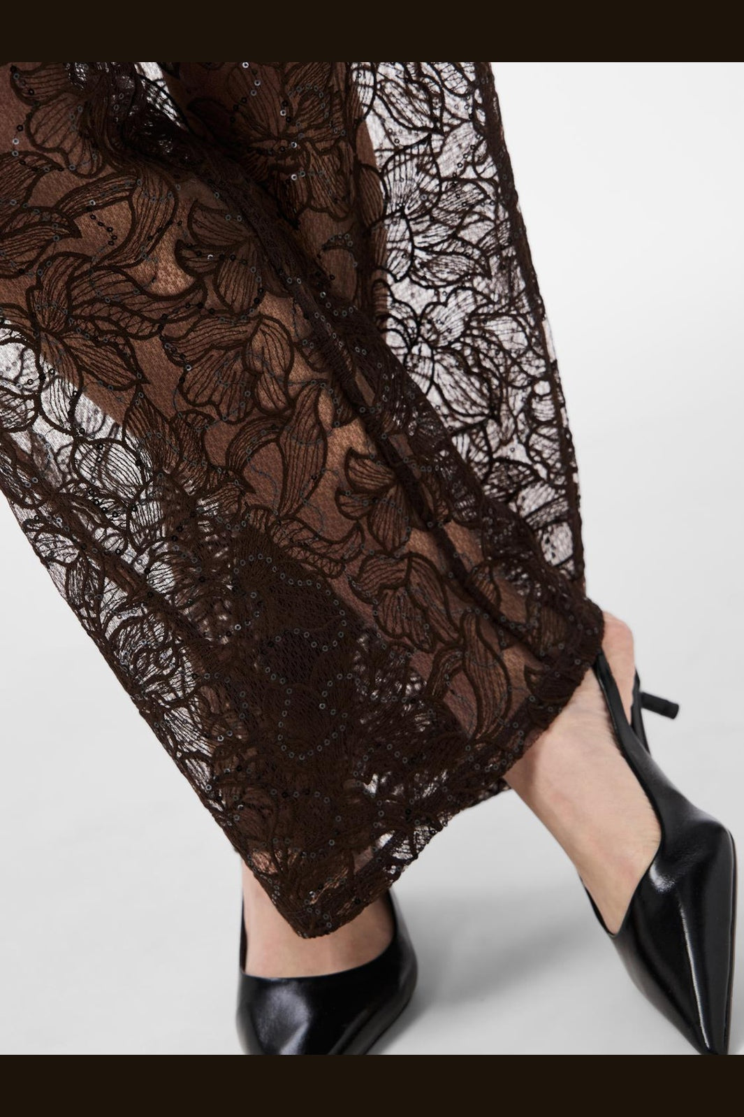 Gerade geschnittene Hose von Pieces, gefertigt aus transparenter Spitze mit Blumenmuster und Pailletten in einem dunklen Braunton.