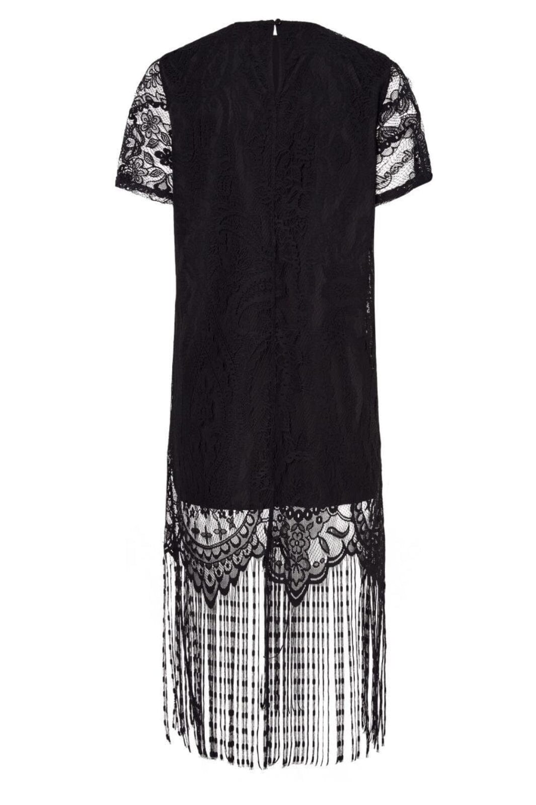 Schwarzes Kleid von Pieces mit Spitzenoberfläche und Fransen am Saum. Das Kleid hat kurze Ärmel, einen runden Ausschnitt und knielange Länge mit einem Spitzenmuster über das gesamte Kleid.