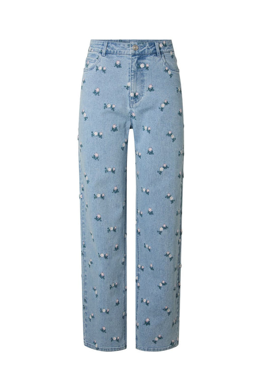 Beige Denimhemd von Pieces mit lockerer Passform und 3/4-Ärmeln. Das Hemd hat einen klassischen Hemdkragen und dunkle Knöpfe, die einen Kontrast zum hellen Denim schaffen.