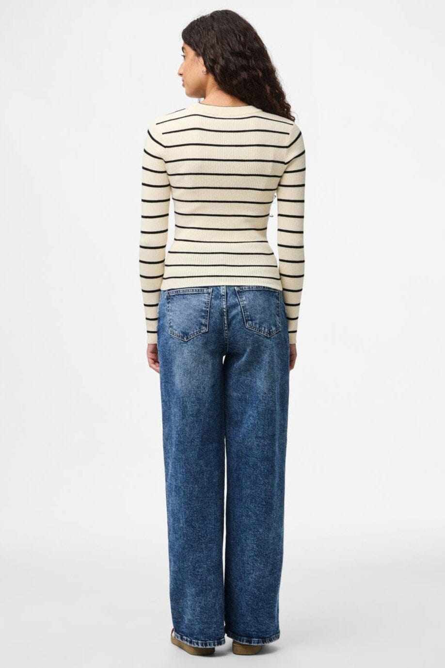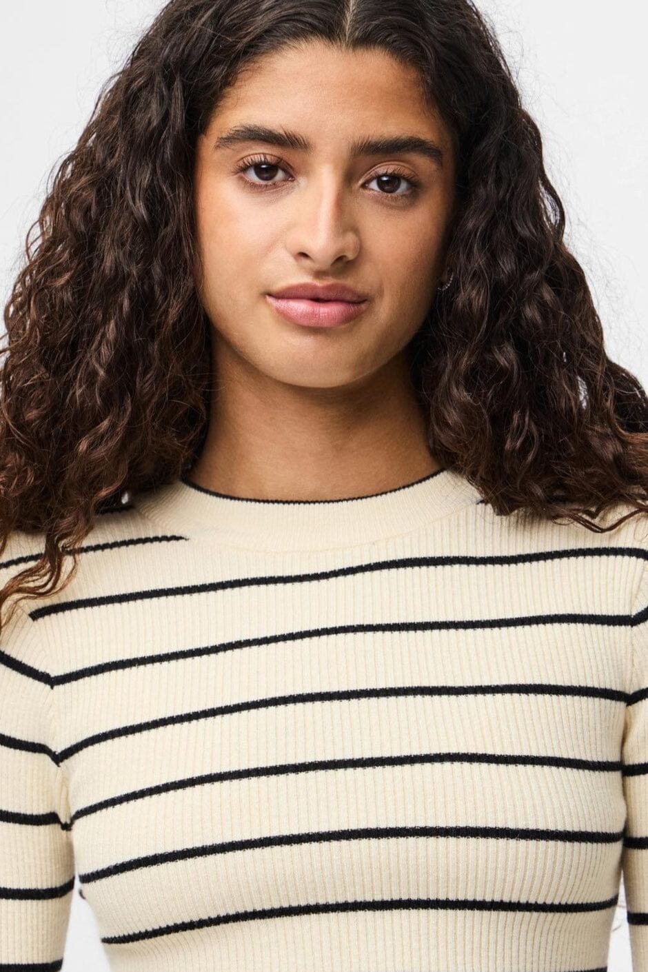 Gestreifter Strickpullover von Pieces mit Rundhalsausschnitt. Die helle Birkenfarbe hat schmale schwarze Streifen, und der Strick hat eine eng anliegende Passform mit gerippter Textur.
