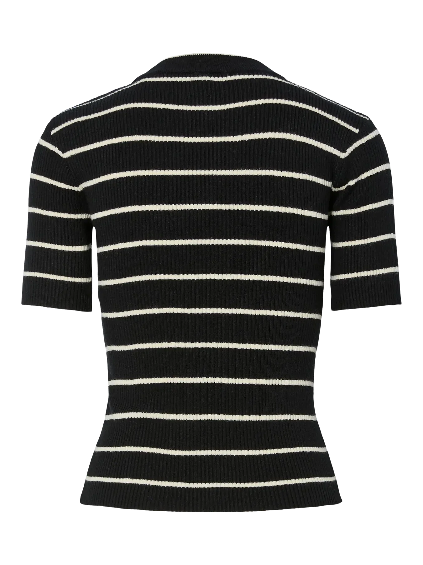 Gestricktes Top von Pieces mit schwarzen und hellen Streifen. Das Top hat kurze Ärmel und einen Rundhalsausschnitt.