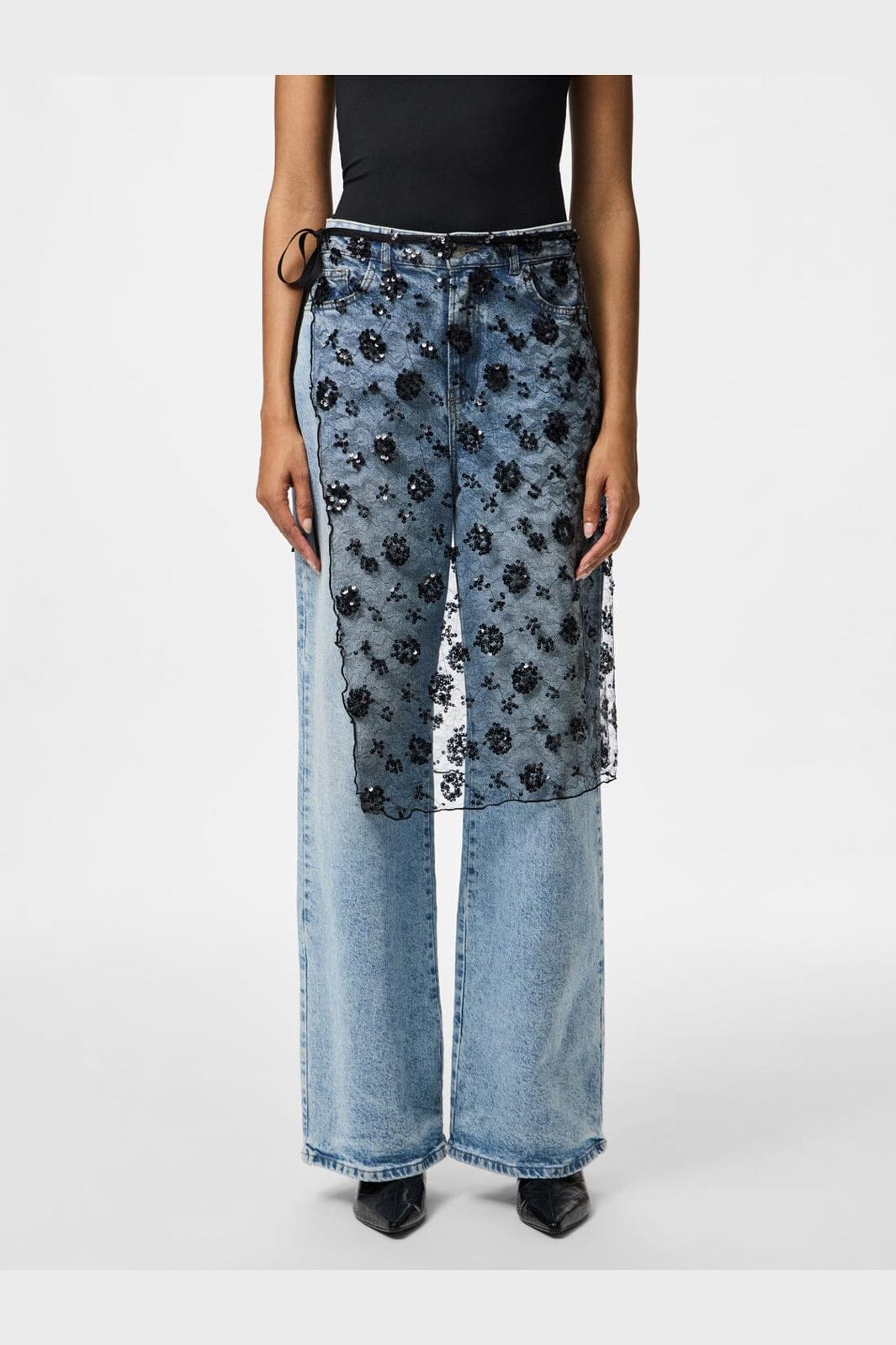 Schwarzer Sarong von Pieces, aus transparenter Spitze mit einem Blumenmuster gefertigt. Der Sarong hat schwarze Pailletten und eine Bindeschnur in der Taille.