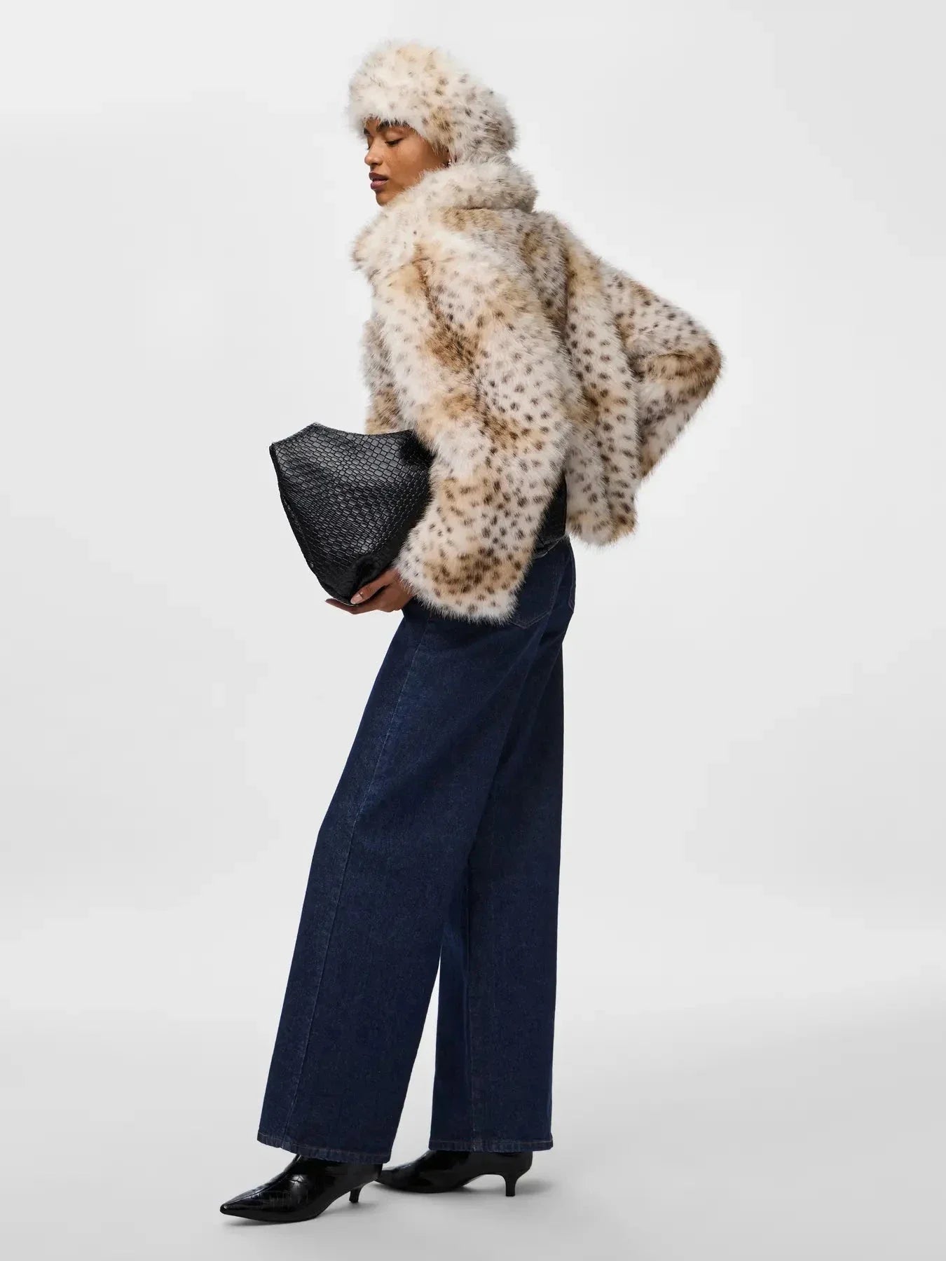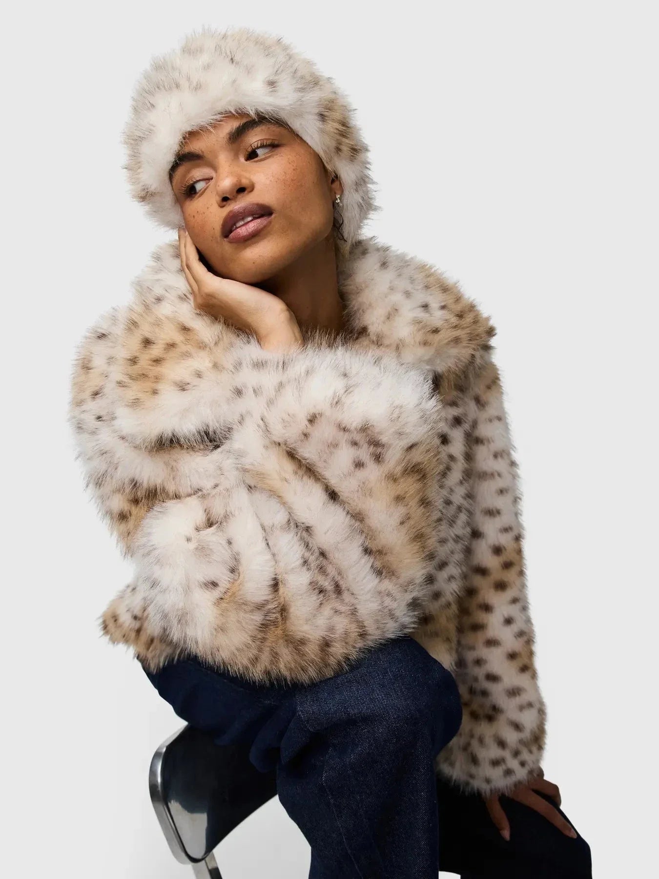 Kurze, flauschige Jacke von Pieces mit Leopardenmuster auf einem hell cremefarbenen Untergrund. Die Jacke hat einen breiten Kragen und eine kurze Länge.