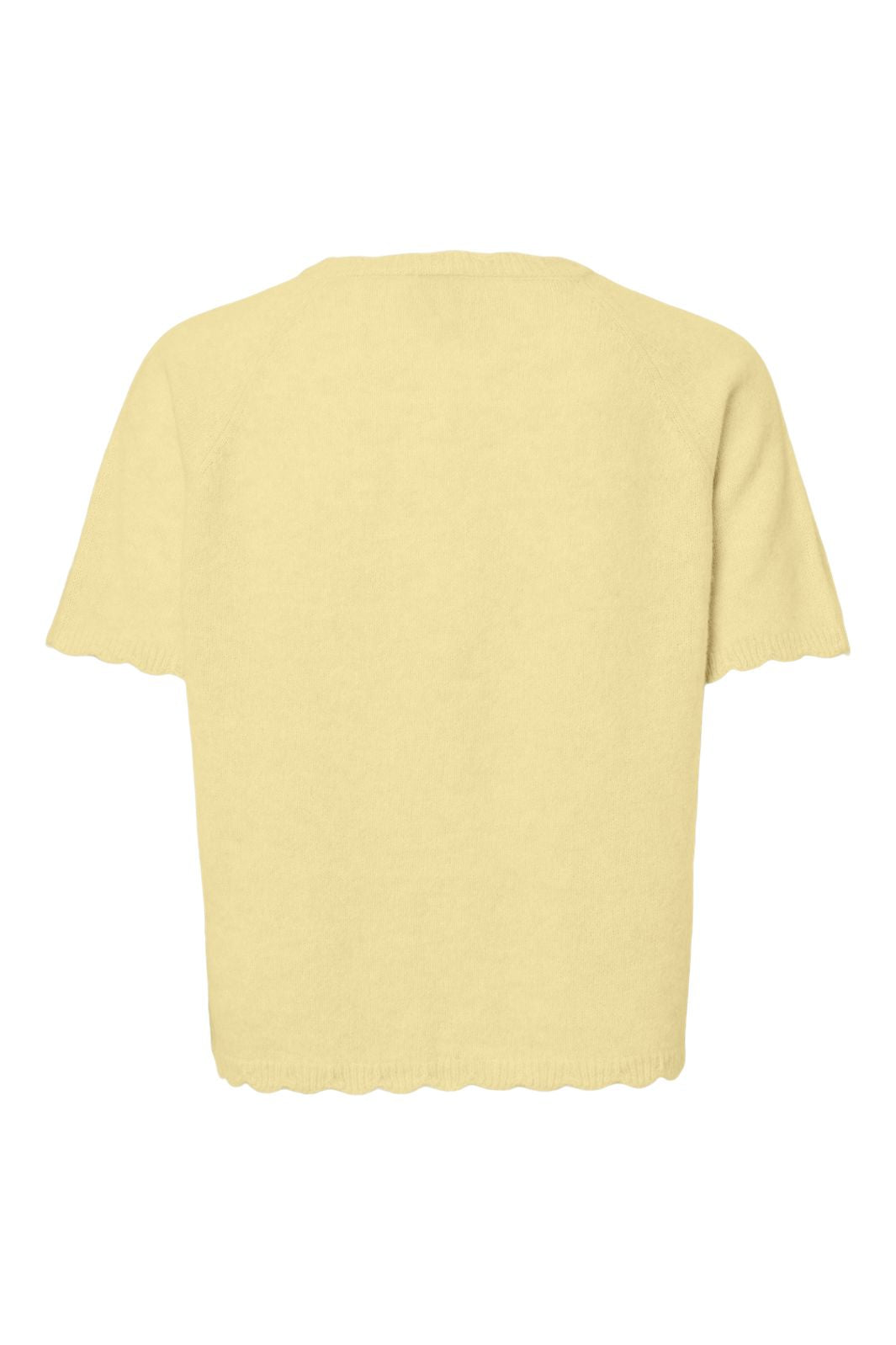 Kurzärmelige Strickjacke von Pieces in der Farbe French Vanilla mit rundem Halsausschnitt. Gestricktes Design mit gewellten Kanten und dekorativen Nähten entlang der Kante.