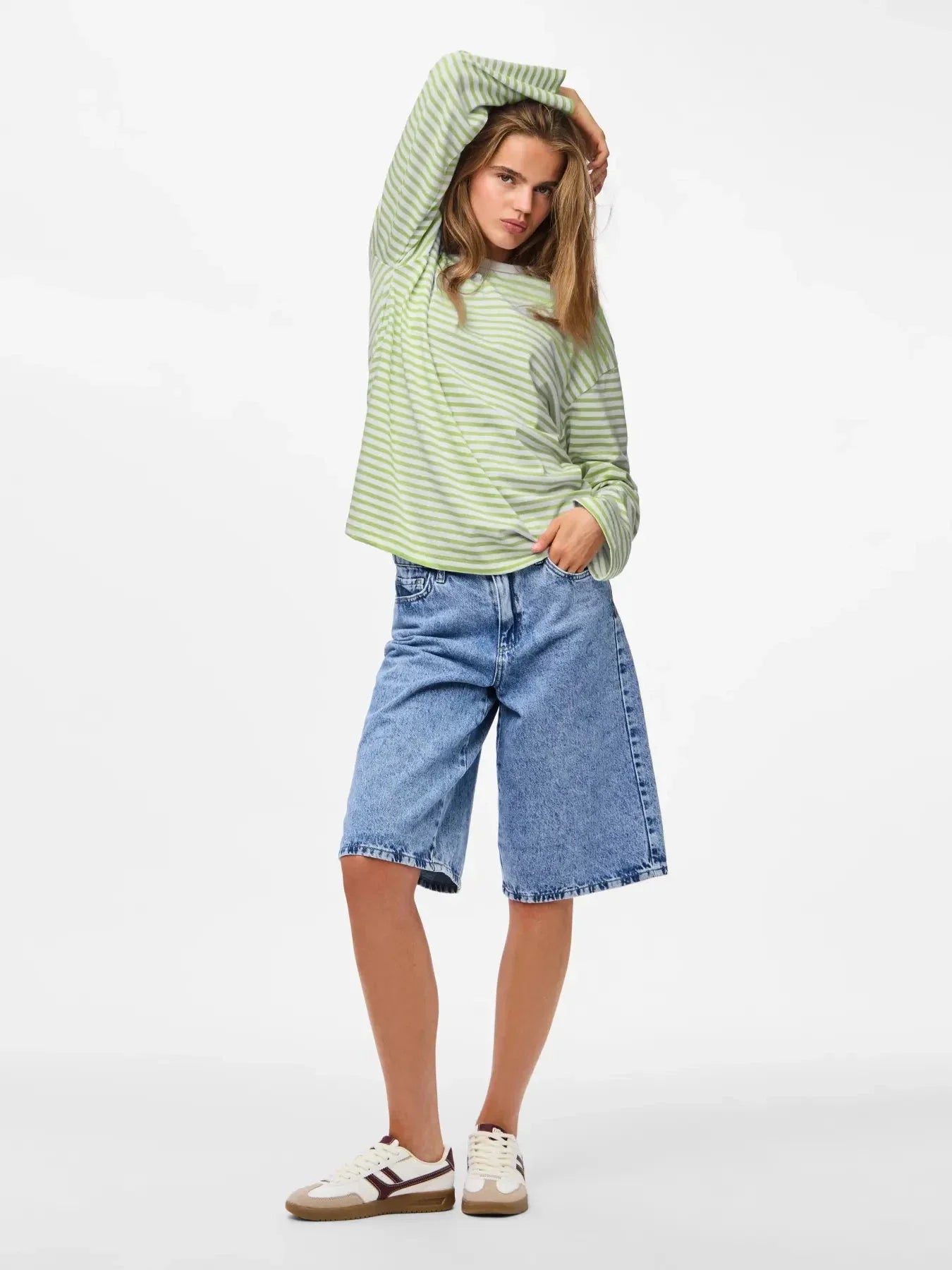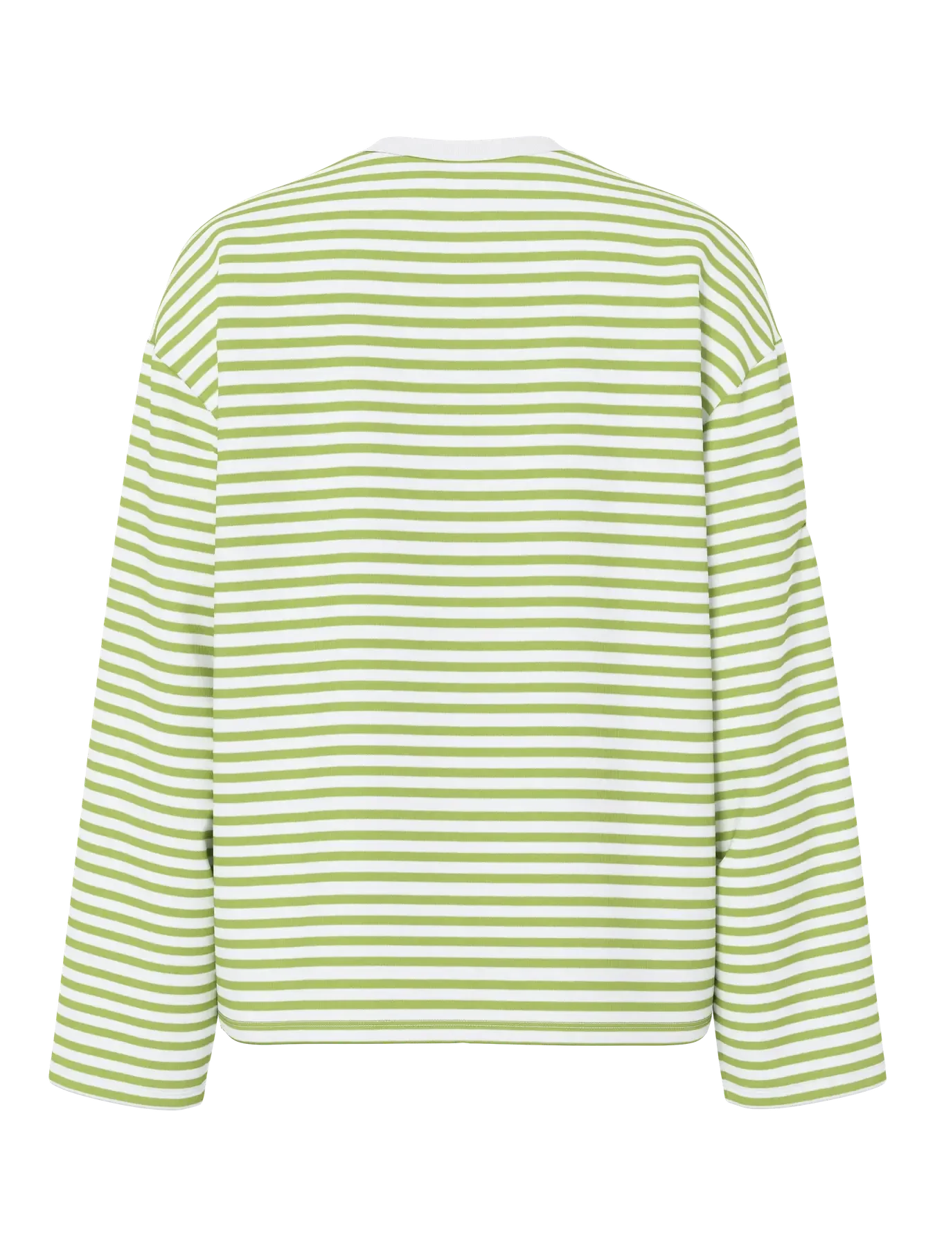 Langärmliges Top von Pieces mit grünen und weißen Streifen. Das Top hat einen Rundhalsausschnitt mit weißem Rand und eine oversized Passform.