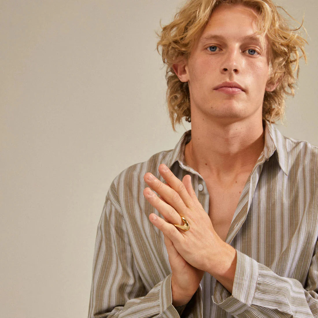 Goldplattierter Ring von Pilgrim mit gebogenem Design. Der Ring hat eine glatte Oberfläche und eine wellenförmige Form, die ihm einen skulpturalen Ausdruck verleiht.