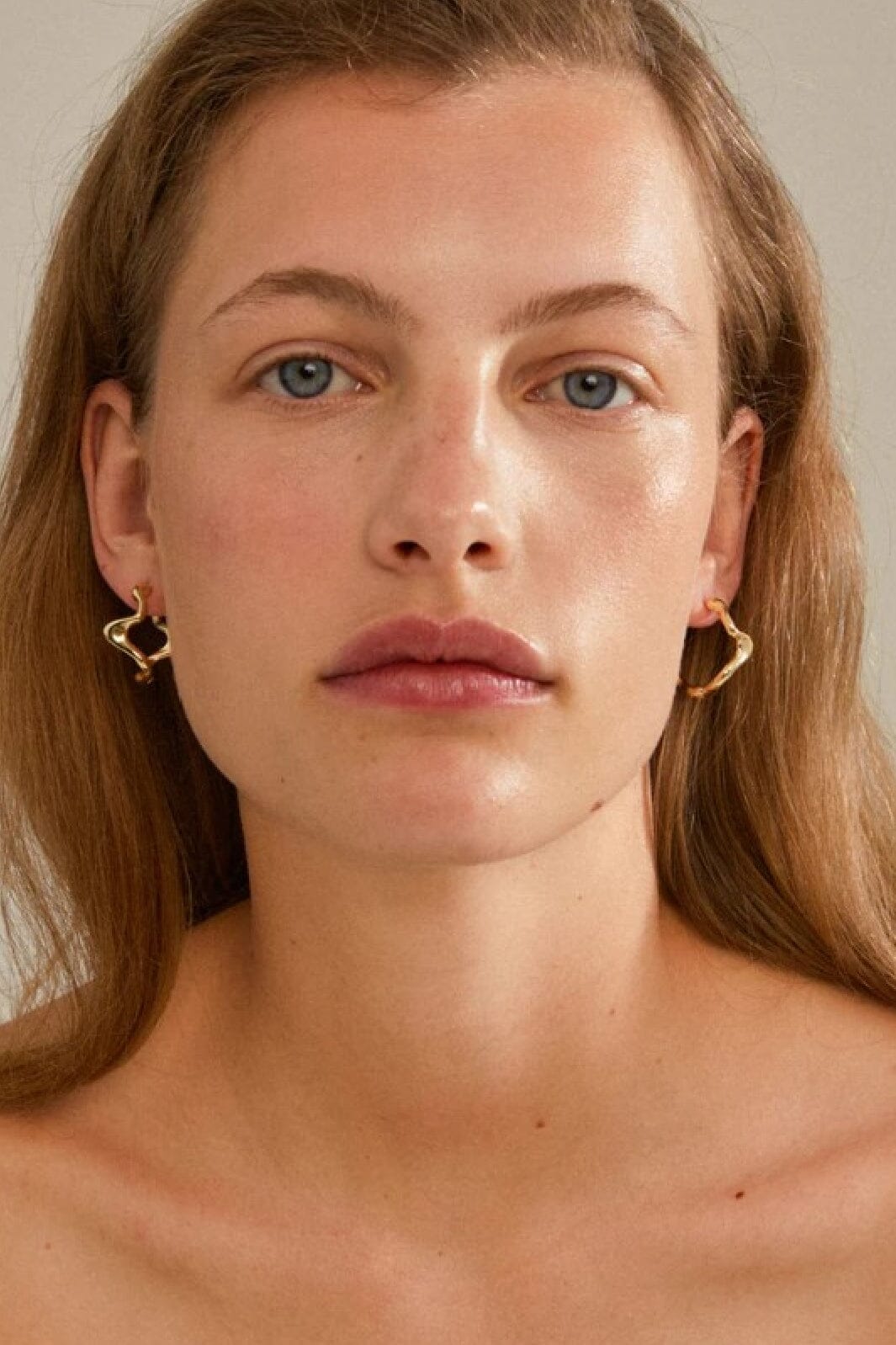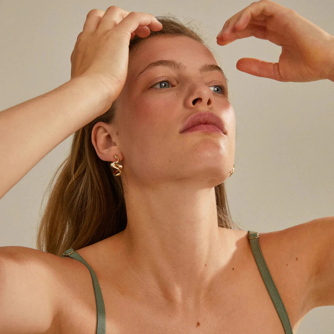 Goldene Ohrringe von Pilgrim mit einem gewellten, skulpturalen Design. Die Ohrringe sind aus recyceltem Messing mit einer glänzenden Goldbeschichtung gefertigt, die die organische Formensprache betont.