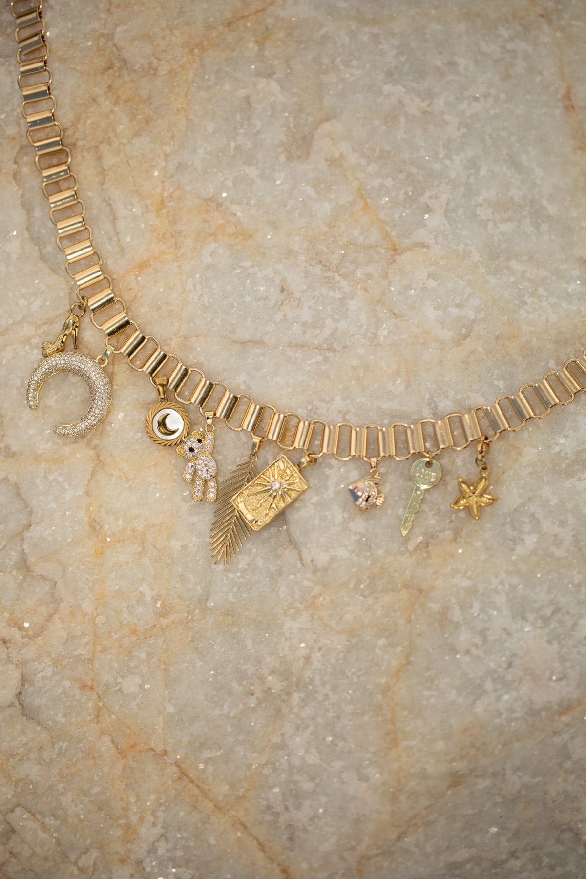 Vergoldete Halskette von Rooted mit rechteckigen Gliedern und verschiedenen Anhängern. Die Halskette besteht aus Messing mit einer goldenen Oberfläche.