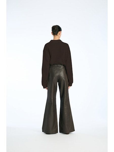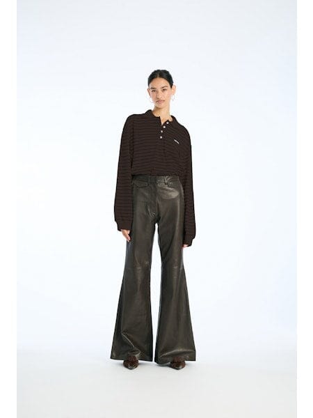 Langärmliges Piqué-Poloshirt von Rotate mit gestreiftem Muster in braunen und beigen Nuancen. Das Poloshirt hat eine Stickerei auf der Brust und eine oversized Passform.