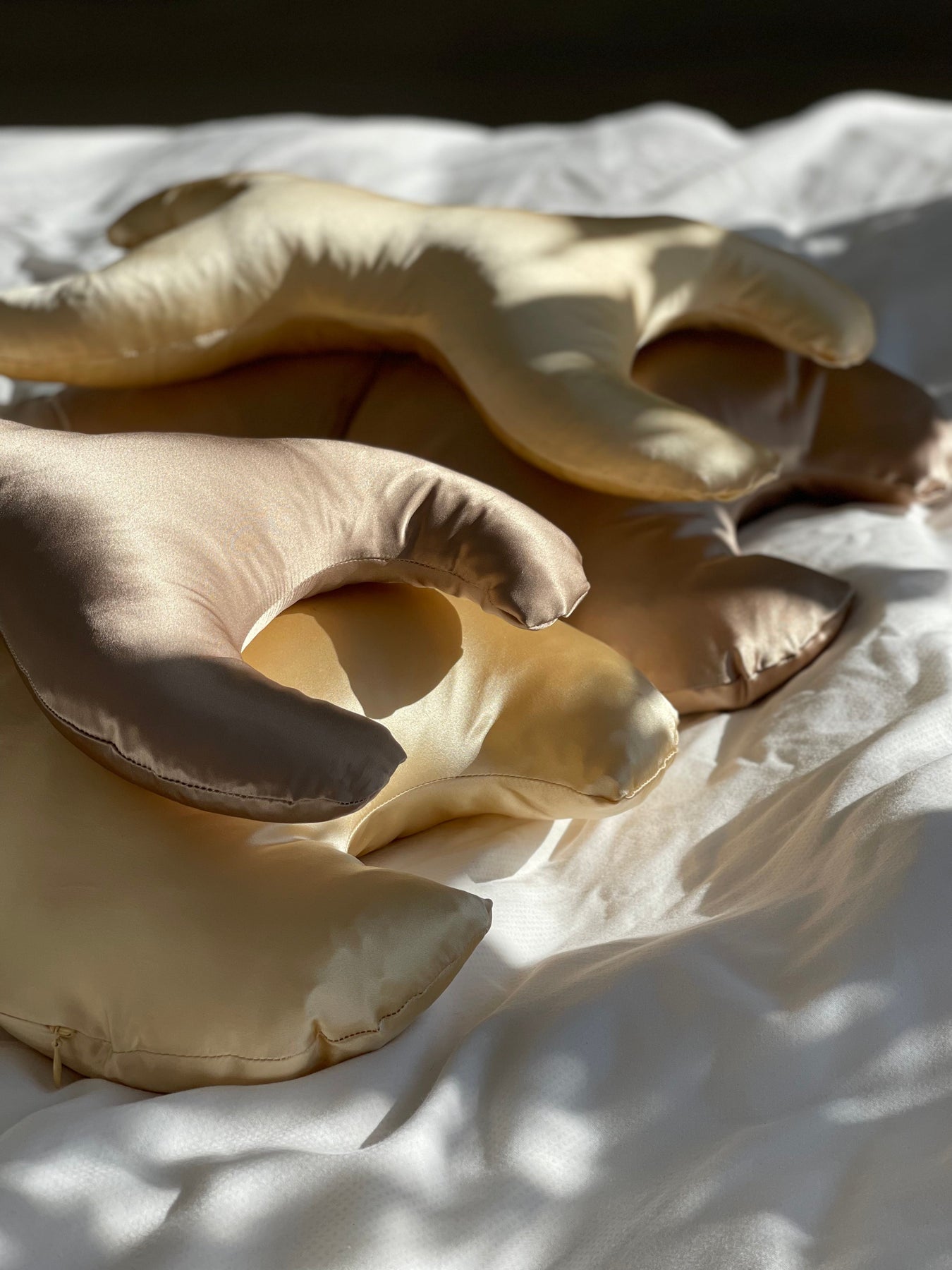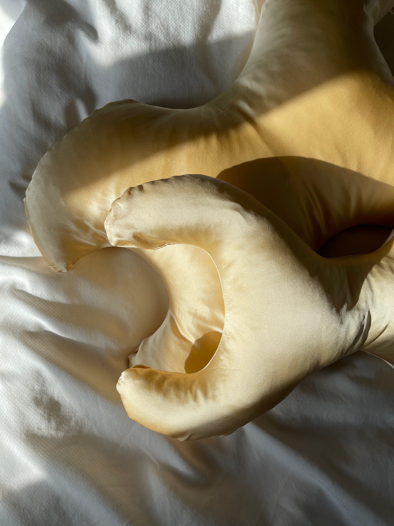 Goldfarbenes Kissenbezug von Save My Face mit einer speziell gestalteten Form. Der Bezug besteht aus weichem Charmeuse-Seide mit temperaturregulierenden und antibakteriellen Eigenschaften.