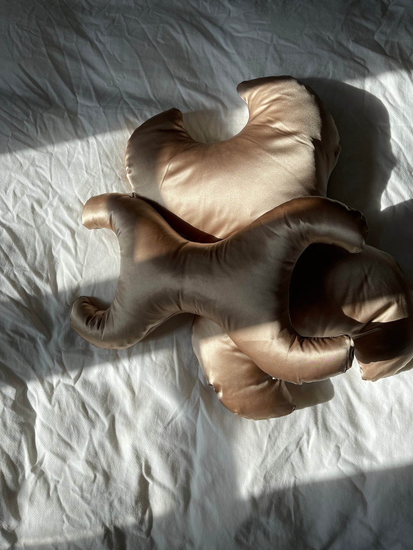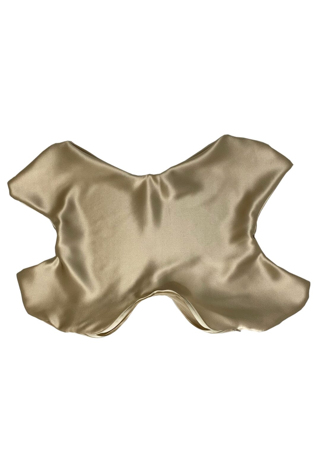 Kissenbezug von Save My Face aus bronzefarbenem Seidenstoff mit X-Form. Der Bezug hat eine glatte Oberfläche und besteht aus Charmeuse-Seide mit natürlichen, hautfreundlichen Eigenschaften.