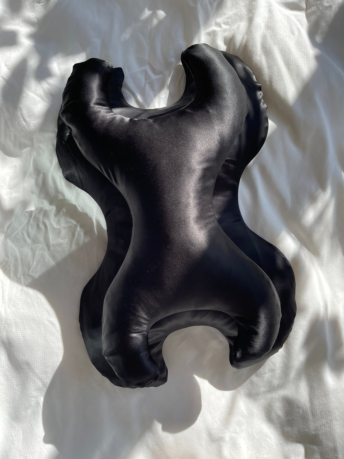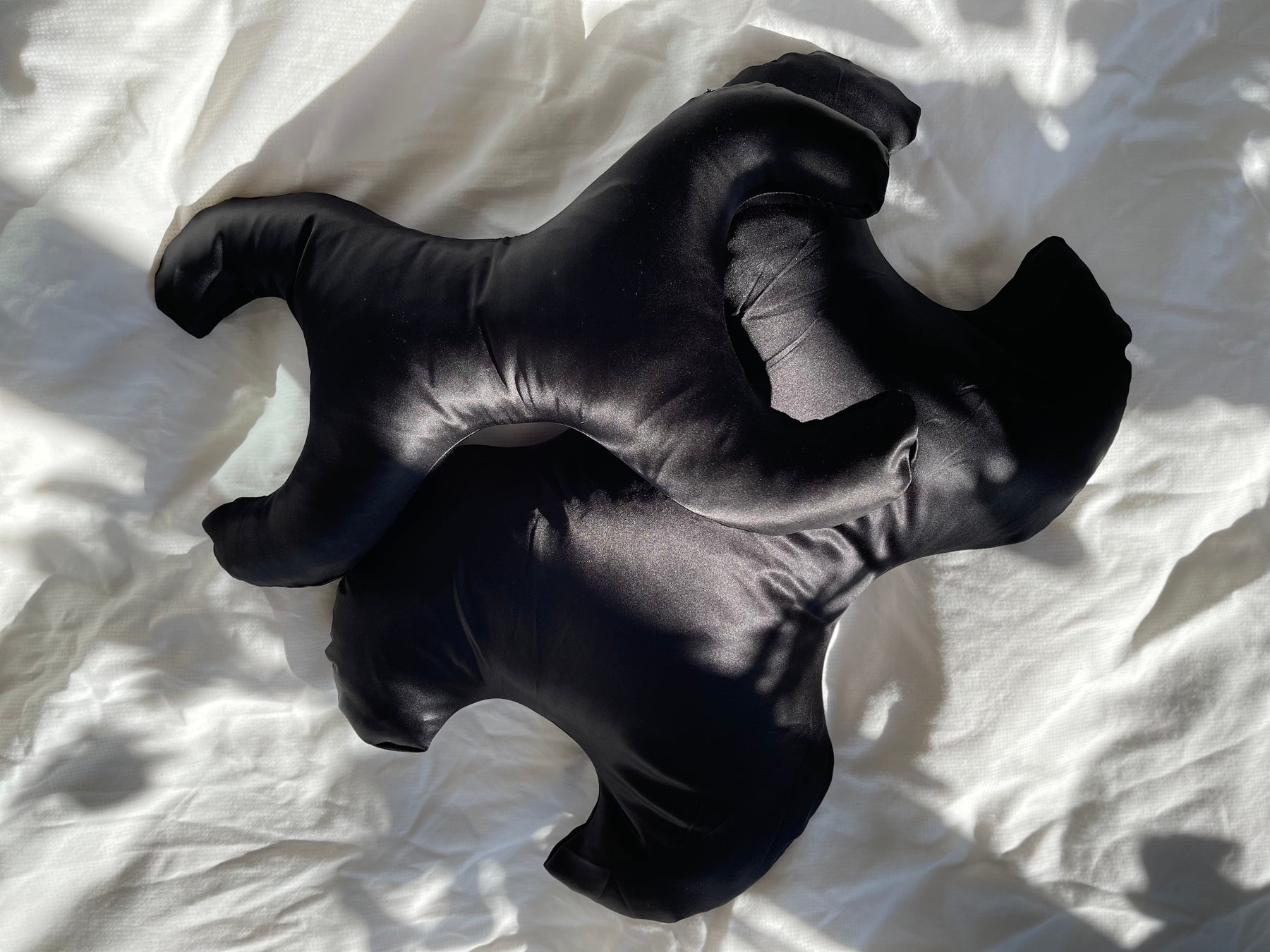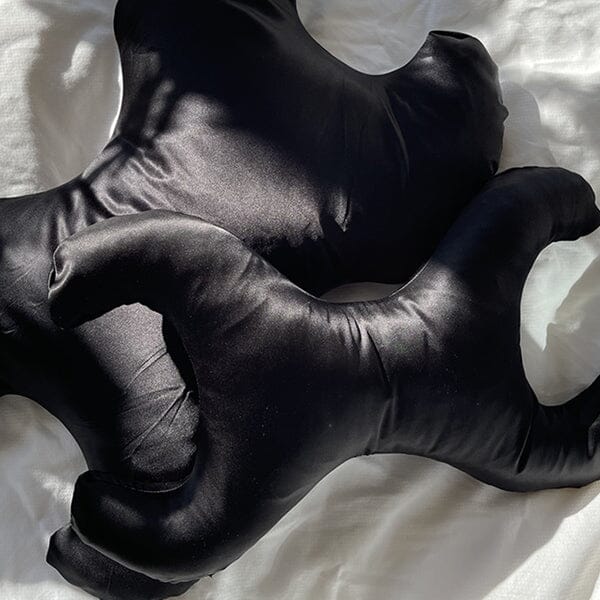 Schwarzes Kissen von Save My Face mit Seidenbezug. Das Kissen hat eine besondere Form und ist mit synthetischen Fasern gefüllt, die bakterienresistent sind.