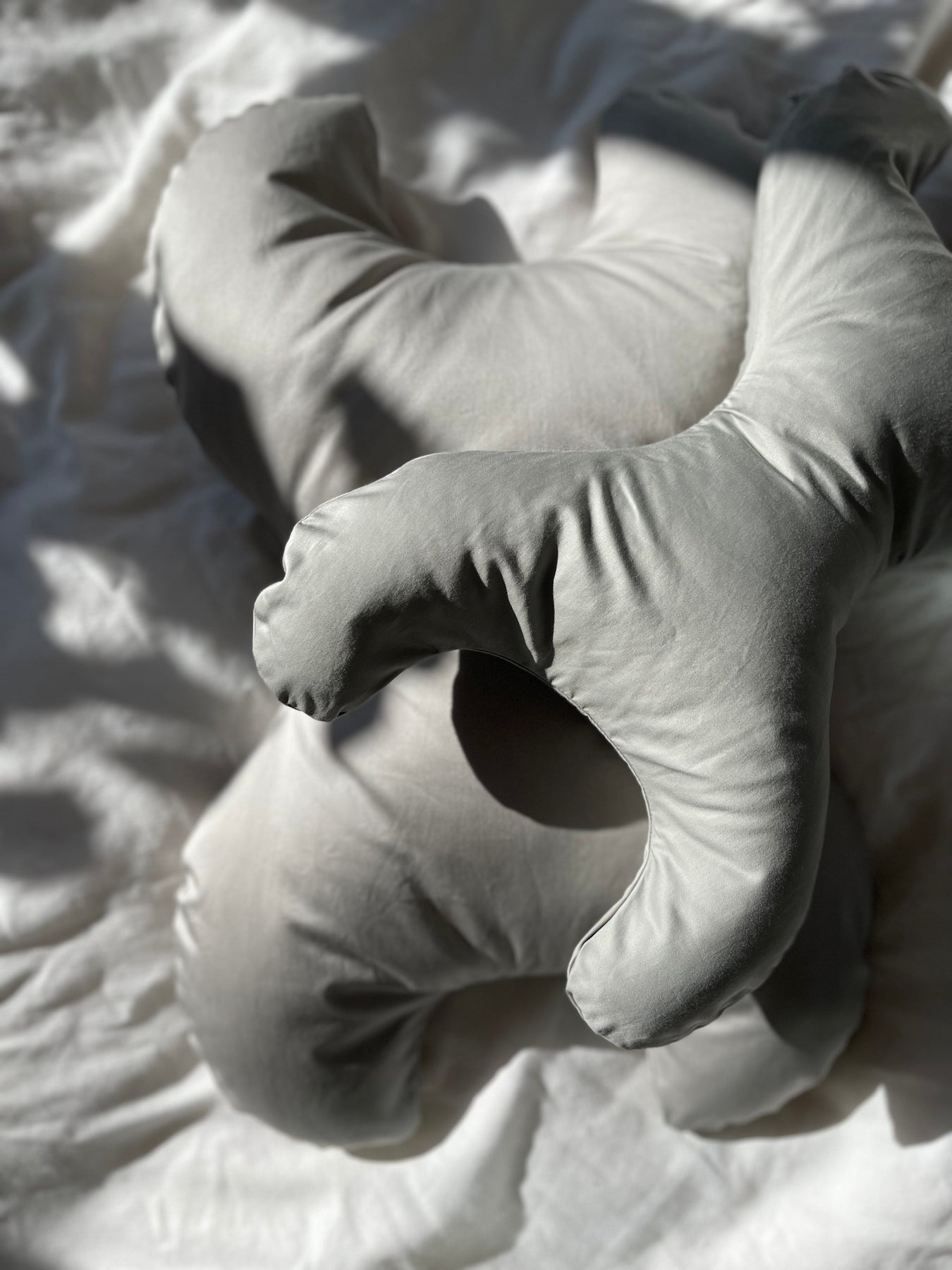 Grau Kissen mit patentierter Sanduhrform von Save My Face. Die spezielle Form hält das Gesicht während des Schlafs frei, und der abnehmbare Bezug macht es einfach, sauber zu halten.