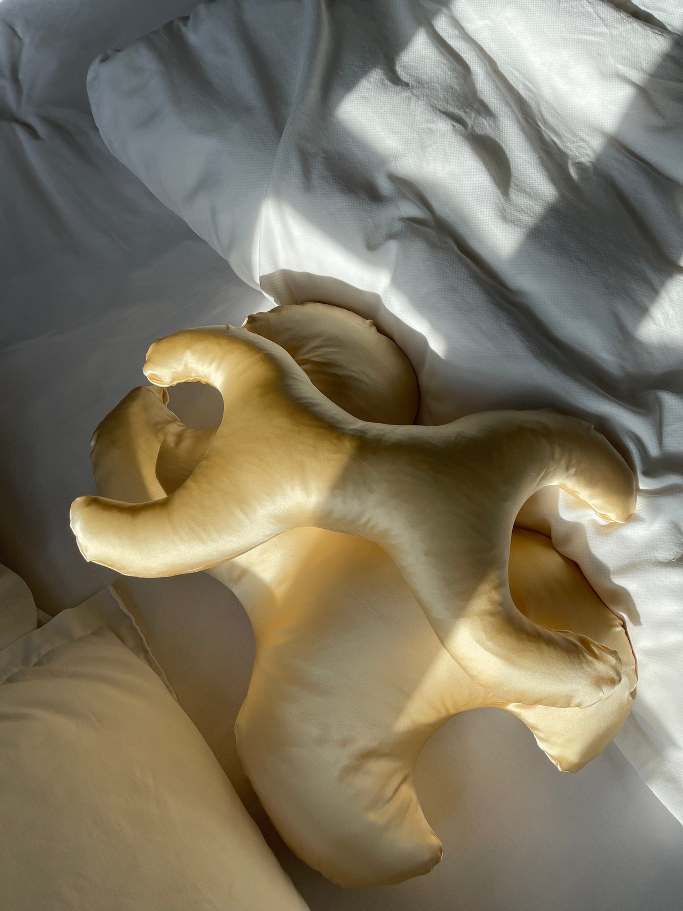 X-förmiges Kissen von Save My Face mit goldenem Seidenbezug. Das Design und die Materialien des Kissens sind darauf ausgelegt, Haar und Haut über Nacht zu schützen, während es gleichzeitig guten Halt bietet.