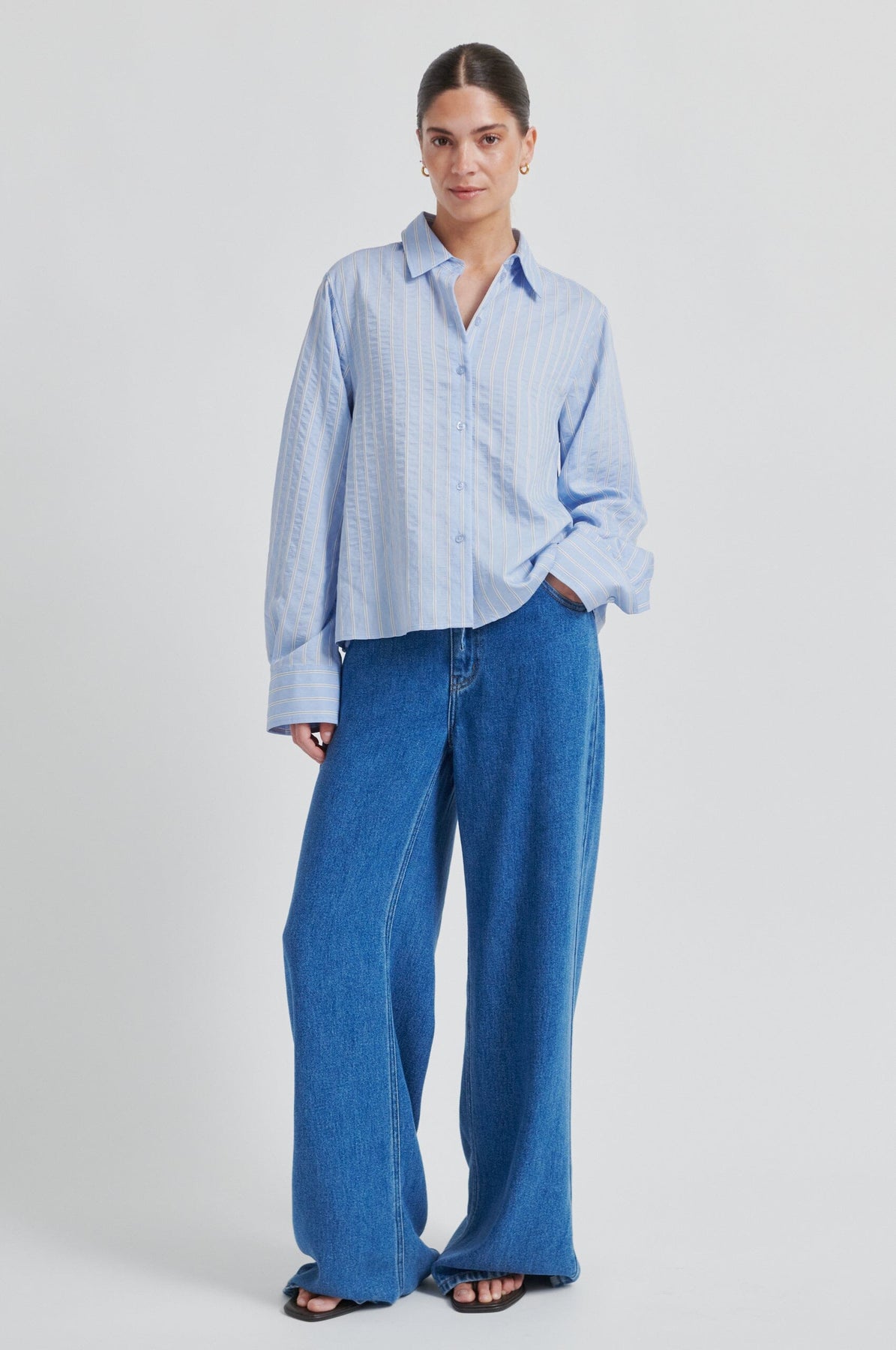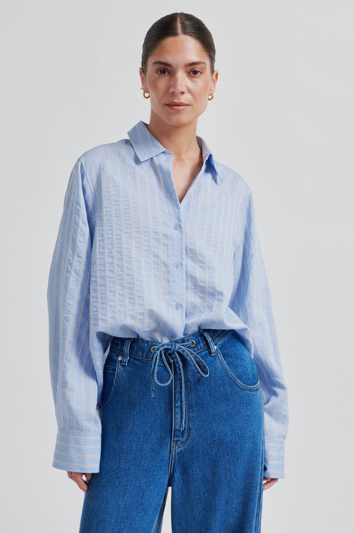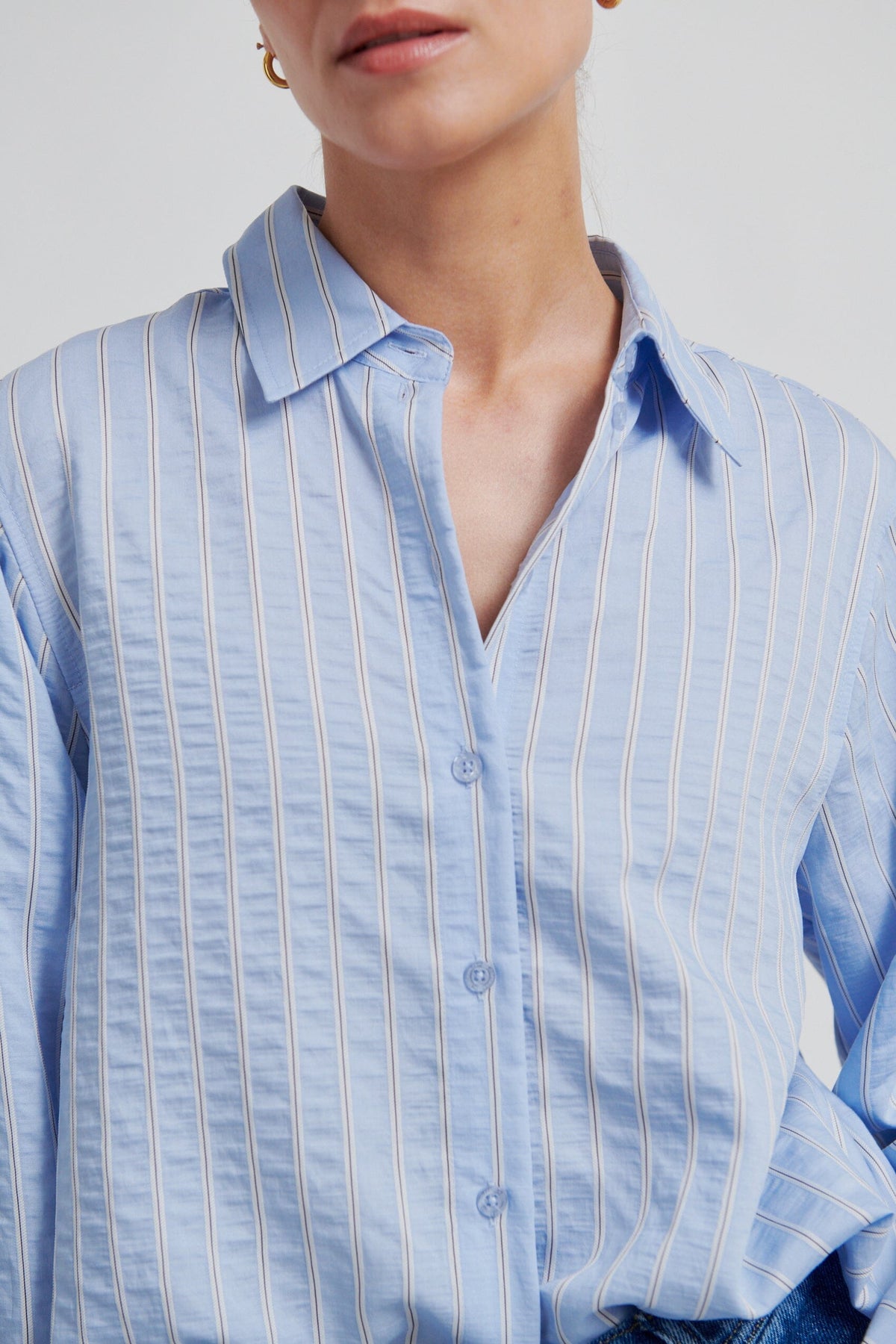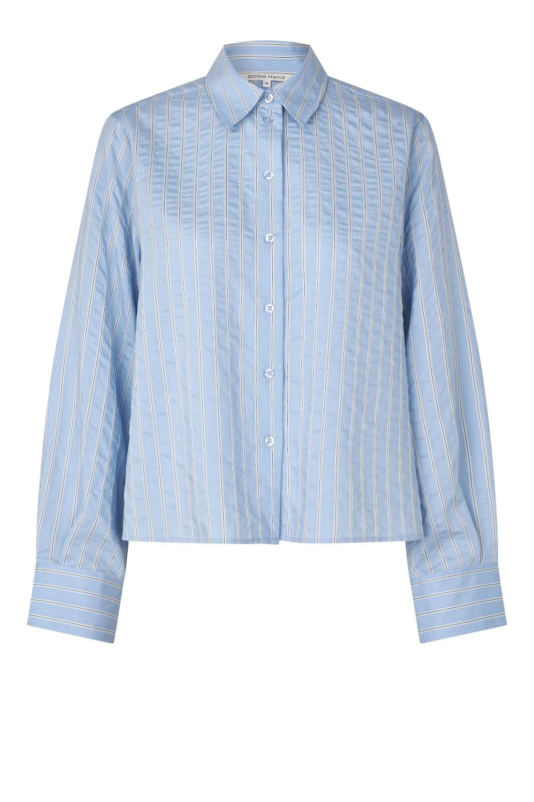 Hellblaues Hemd mit weißen Streifen von Second Female. Das Hemd besteht aus einer weichen Mischung mit 72% Viskose und hat eine kurze, weite Passform.