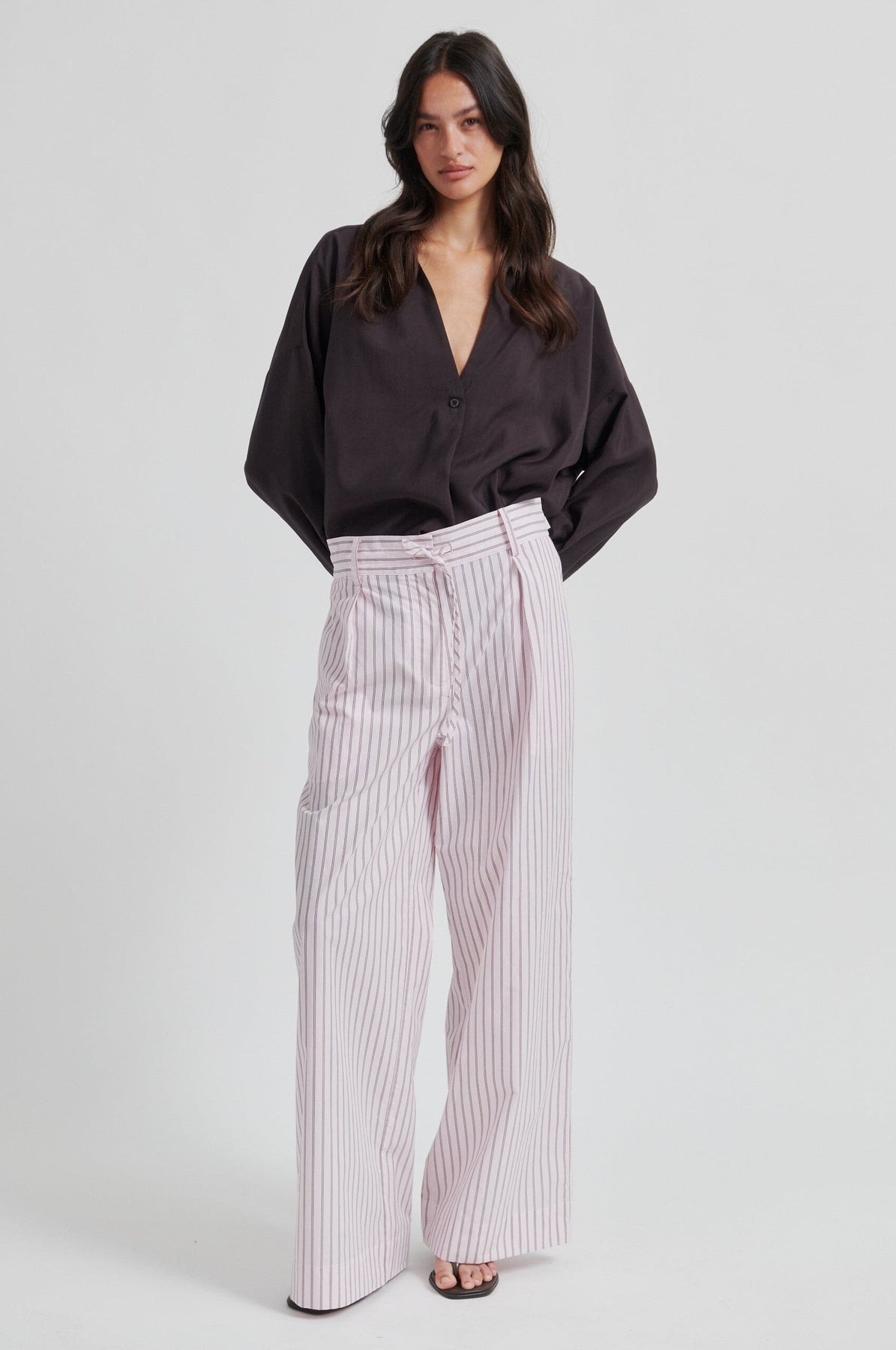 Hose von Second Female aus helllila Baumwolle mit vertikalen Streifen. Die Hose hat weite, gerade Beine und eine lockere Passform.