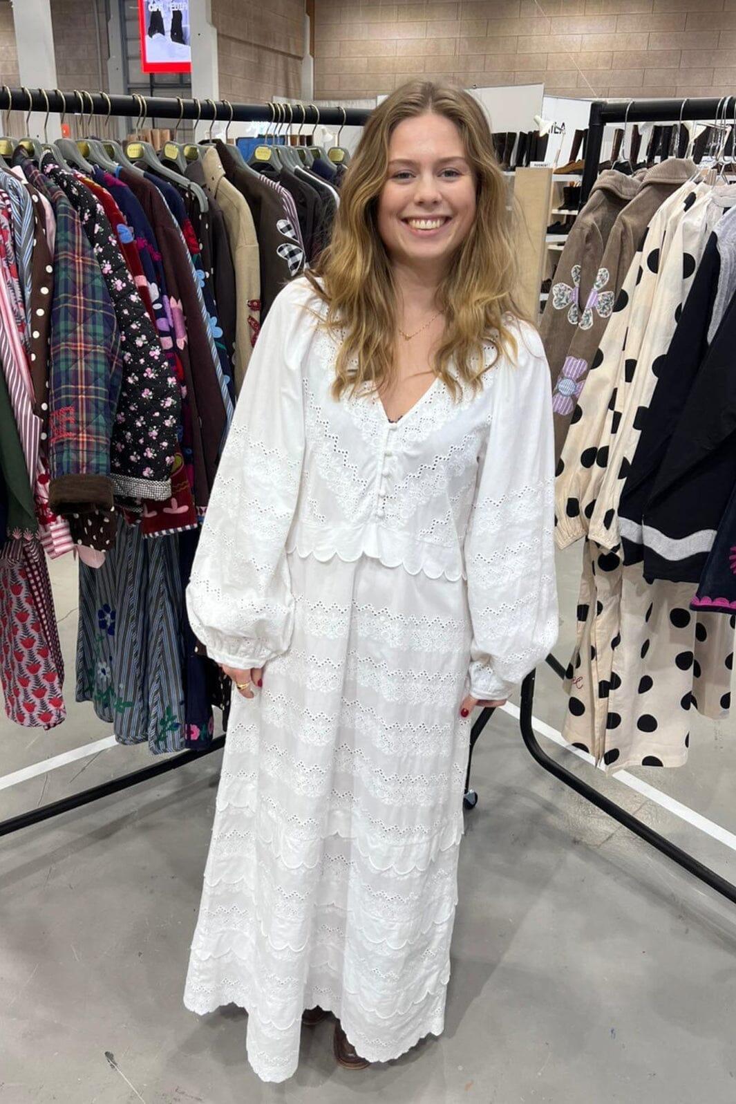 Kleid von Sissel Edelbo in Off-White. Hergestellt aus Broderie Anglaise-Stoff mit gestickten Löchern. Das Kleid hat einen tiefen V-Ausschnitt und lange Ärmel.