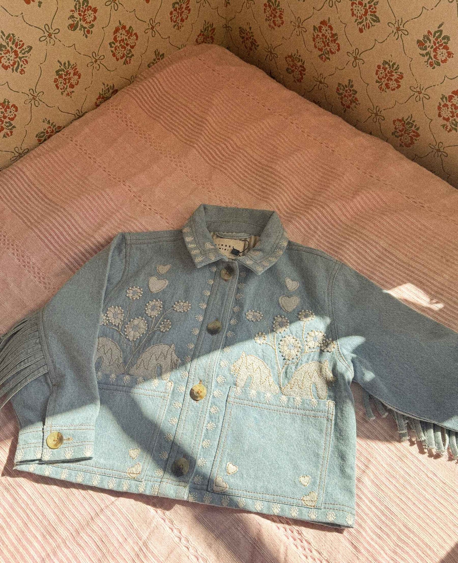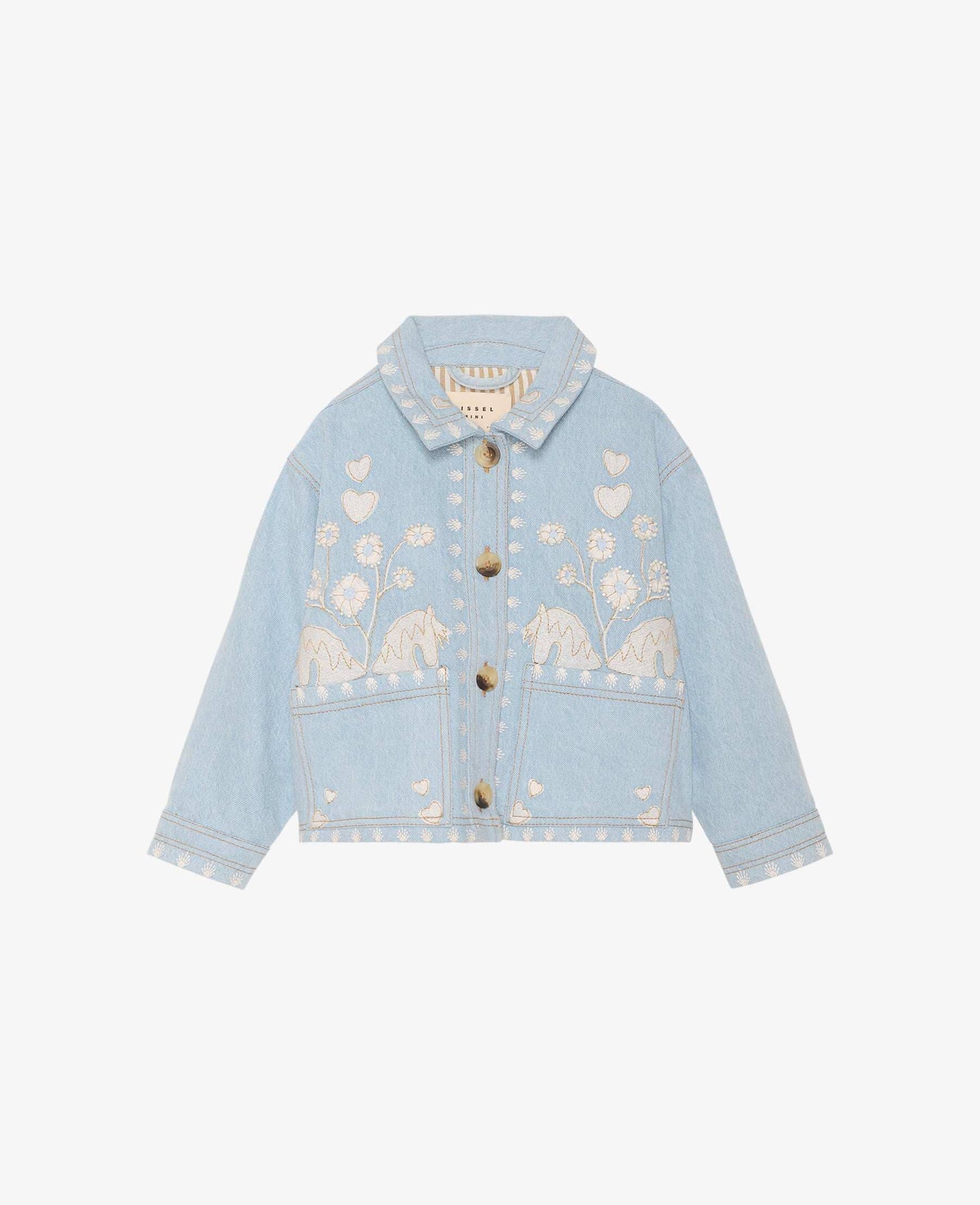 Hellblaue Jeansjacke von Sissel Edelbo mit gestickten Blumen und Herzen. Die Jacke hat eine oversized Passform mit Hemdkragen und Knöpfen entlang der gesamten Vorderseite.