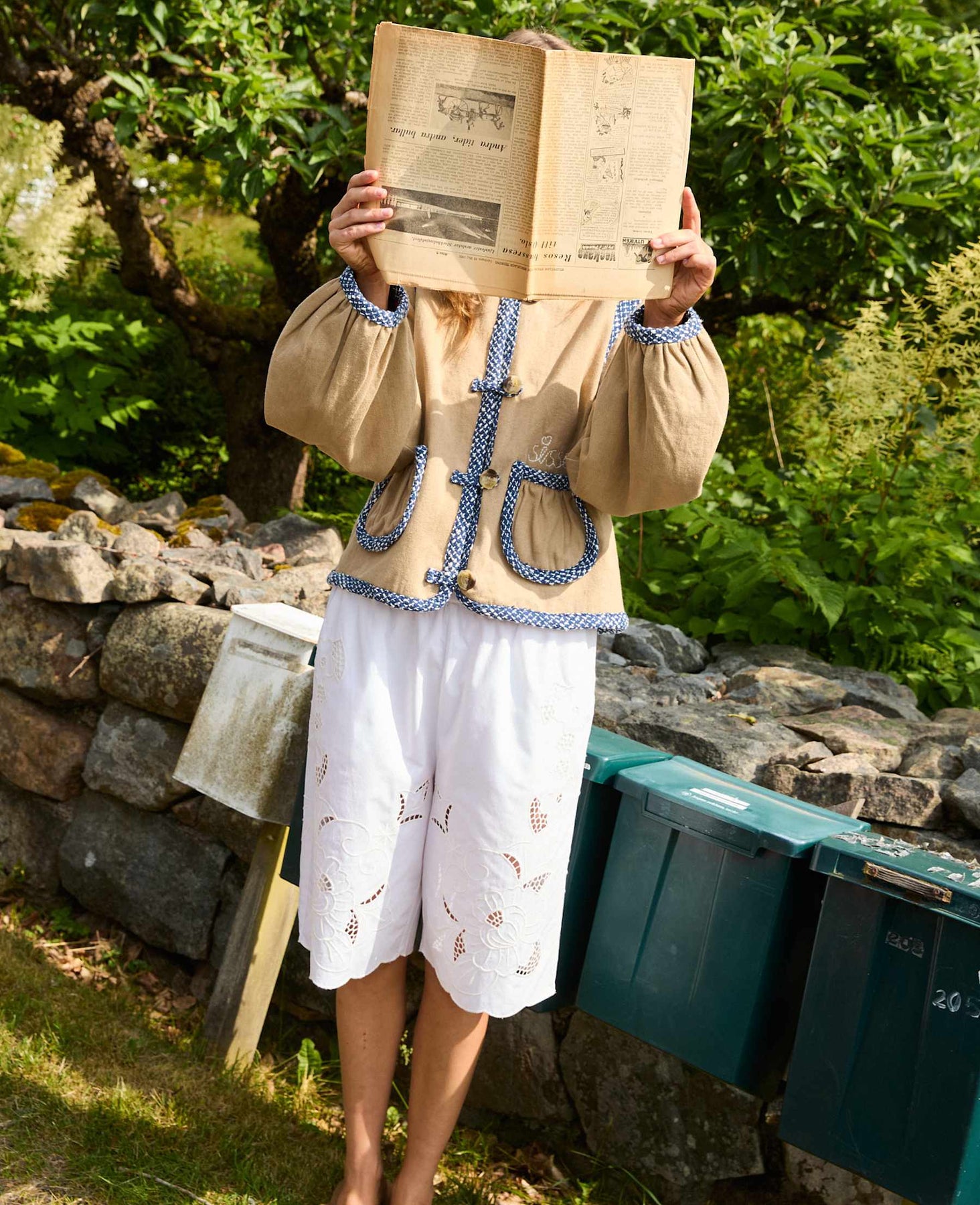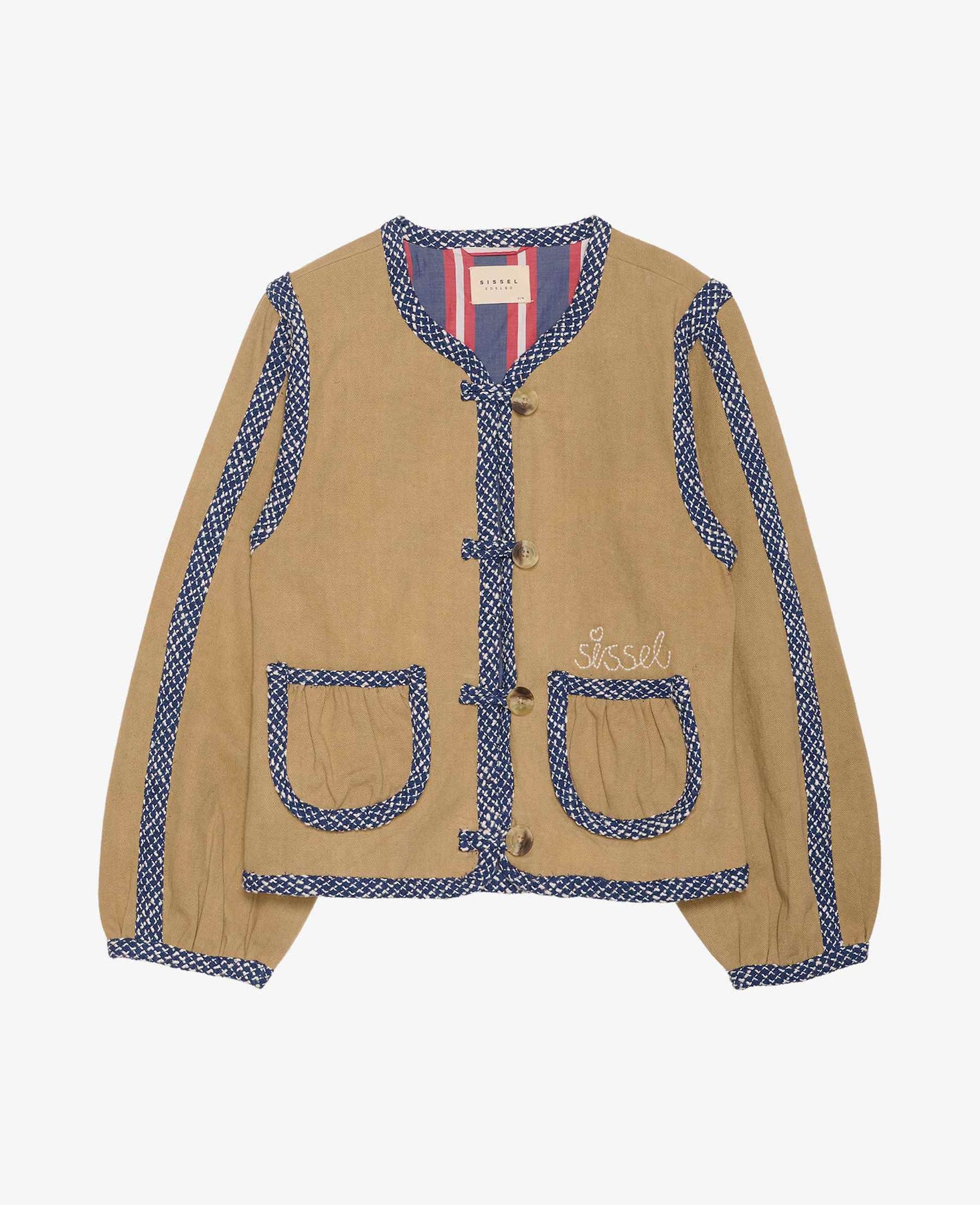 Jacke von Sissel Edelbo aus sandfarbener Baumwolltwill mit blauen gemusterten Bouclé-Besätzen entlang des Kragens, der Ärmel und der Taschen.