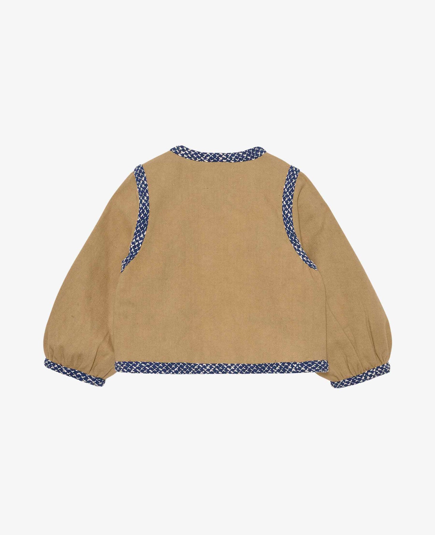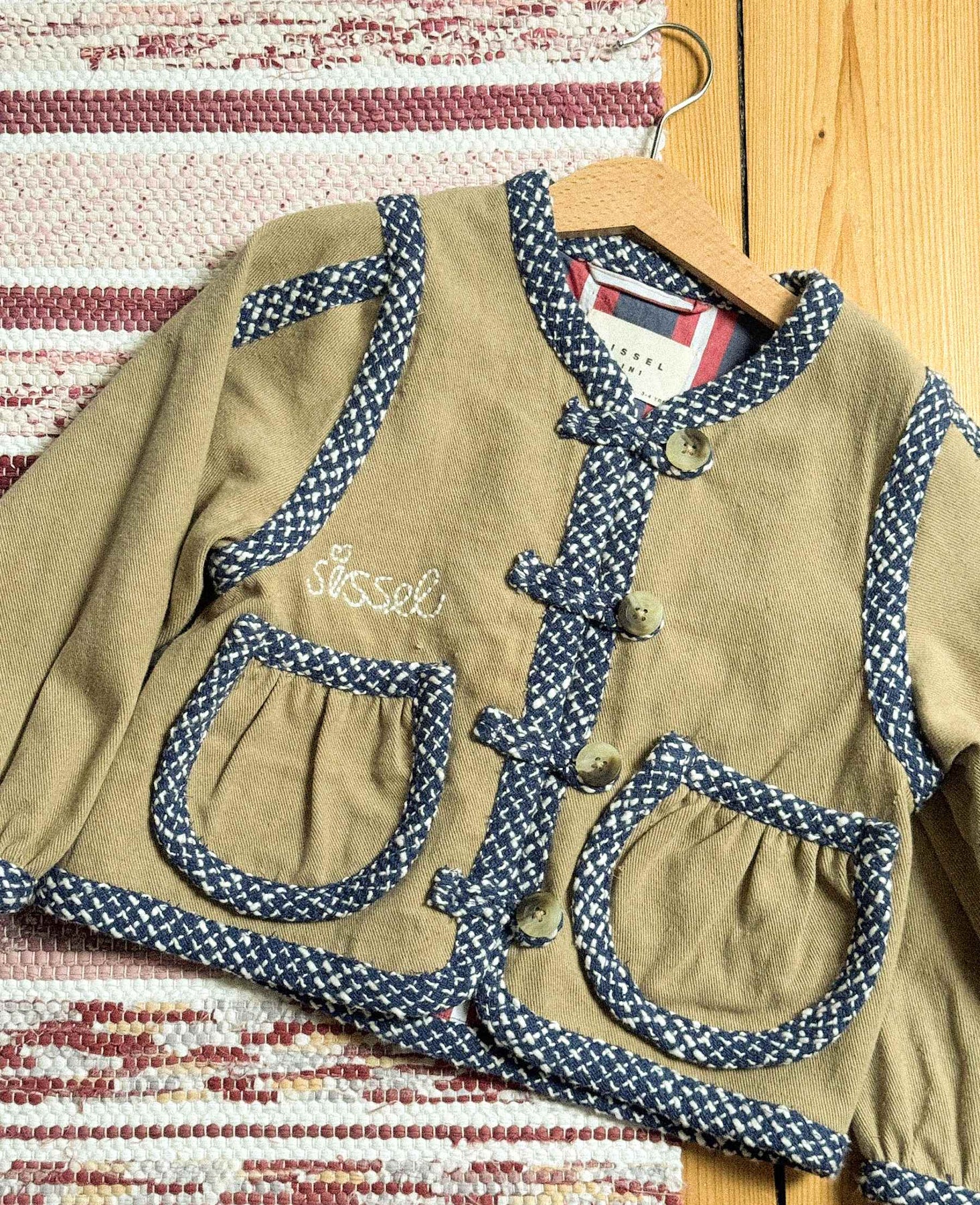 Eine sandfarbene Jacke von Sissel Edelbo mit blau-weiß gemusterten Paspeln. Die Jacke hat Stickereien und dekorative Nähte.