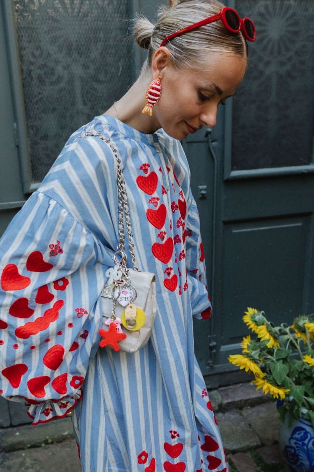 Gestreiftes Kleid von Sissel Edelbo aus Bio-Baumwollpopeline. Das hellblaue und weiße gestreifte Kleid hat rote Herzstickereien und Perlenknöpfe auf der Vorderseite.