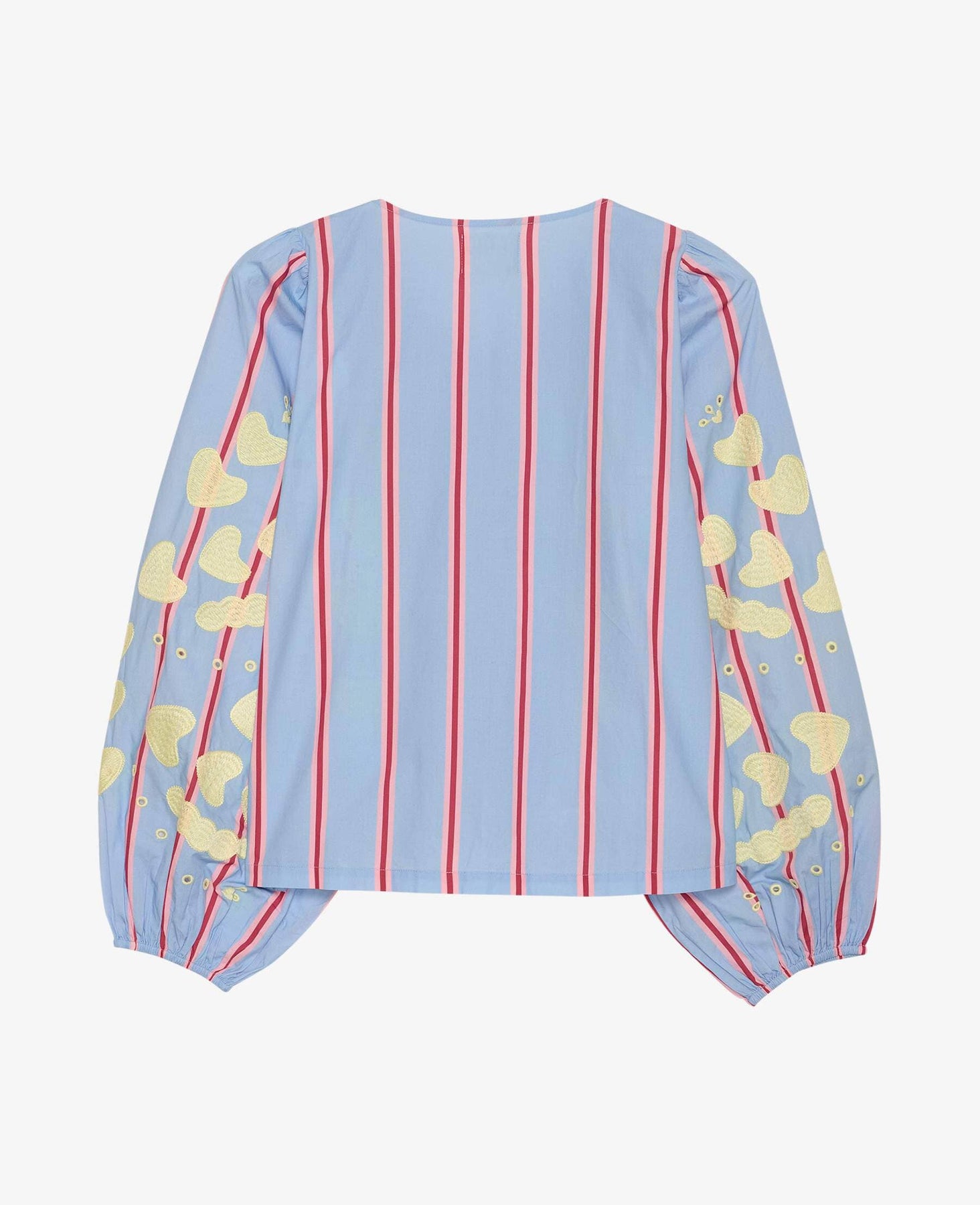 Hellblaues Top von Sissel Edelbo mit roten Streifen und grünen Herzstickereien. Das Top besteht aus 100 % Bio-Baumwollpopeline mit offener Front.