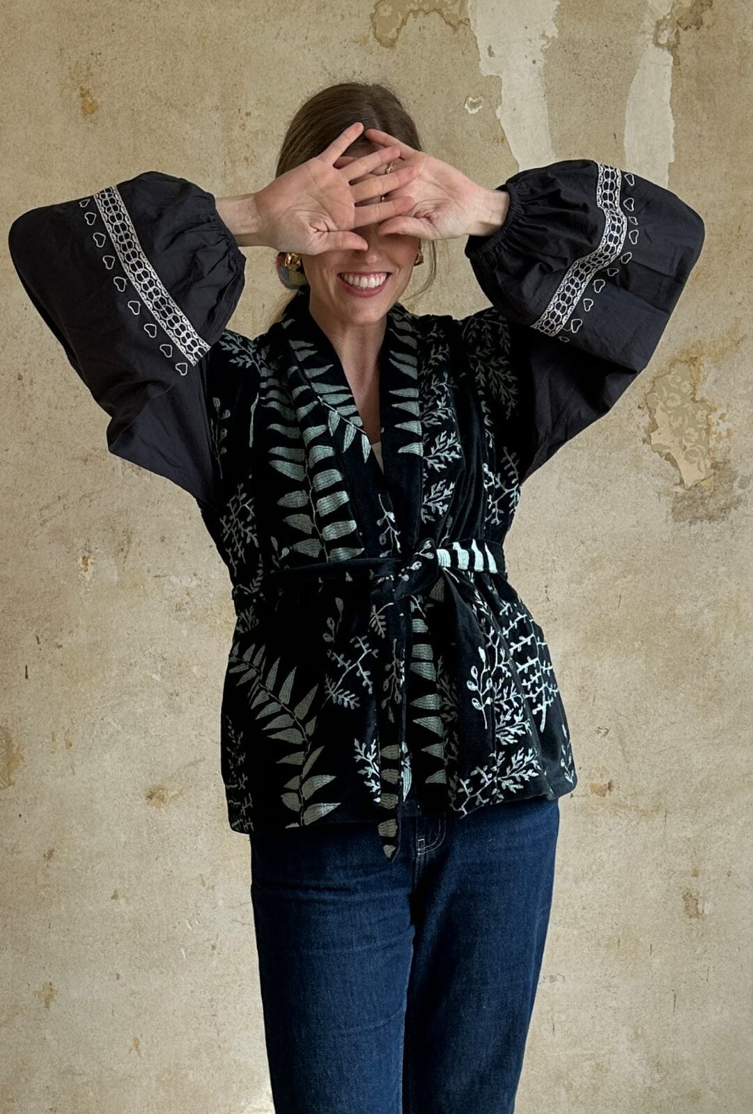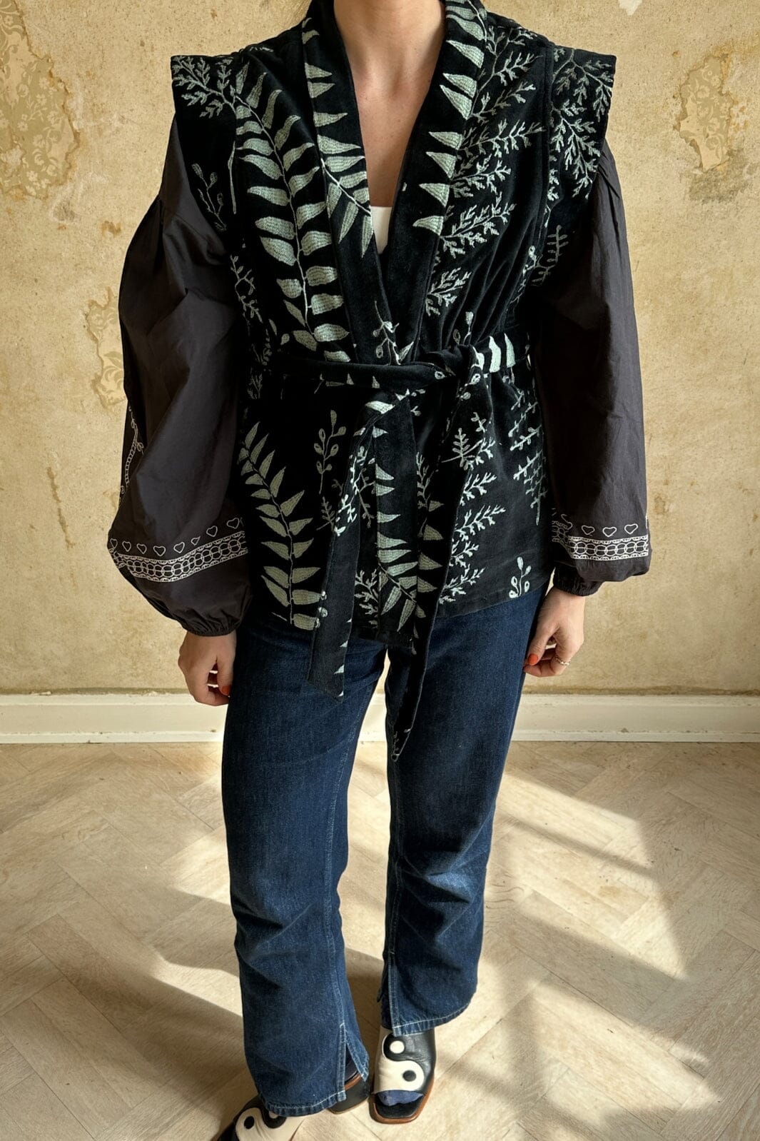 Dunkel Weste von Sissel Edelbo aus Bio-Baumwolle mit bestickten Blättern. Sie hat breite Schultern, Seitentaschen und einen abnehmbaren Gürtel. Innen gefüttert mit handgemachtem Blockdruck.