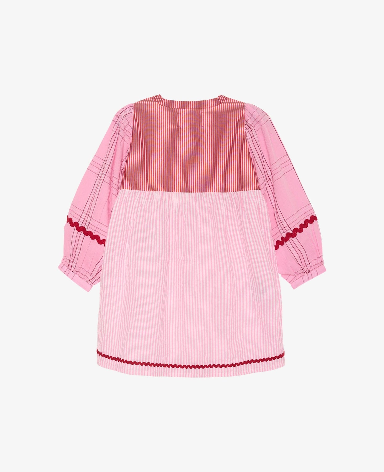 Minikleid von Sissel Edelbo in Rosa und Rot mit Streifen. Das Kleid hat handgefertigte Details wie Rüschen, Schleifen und Stickereien sowie lange Ballonärmel mit Zickzackband.