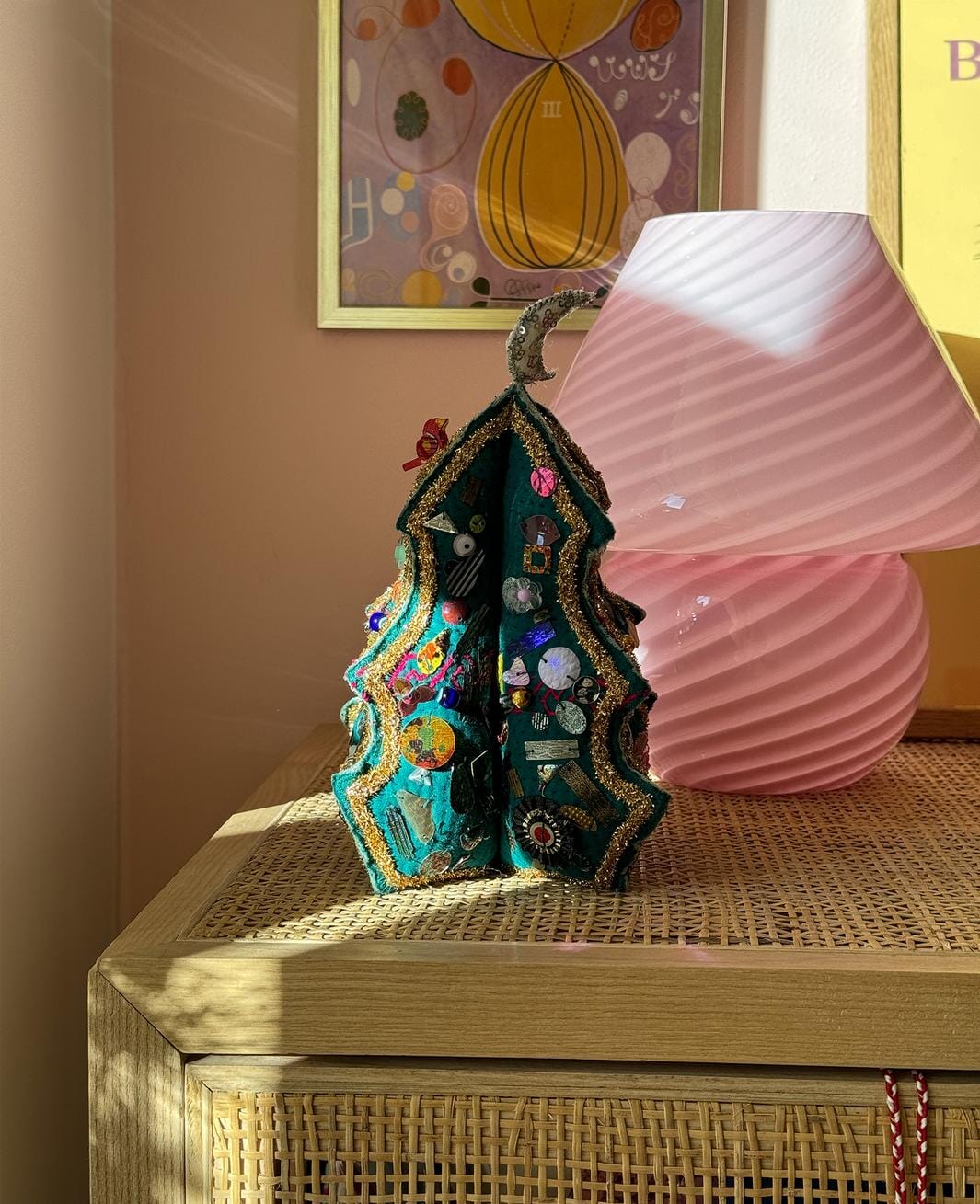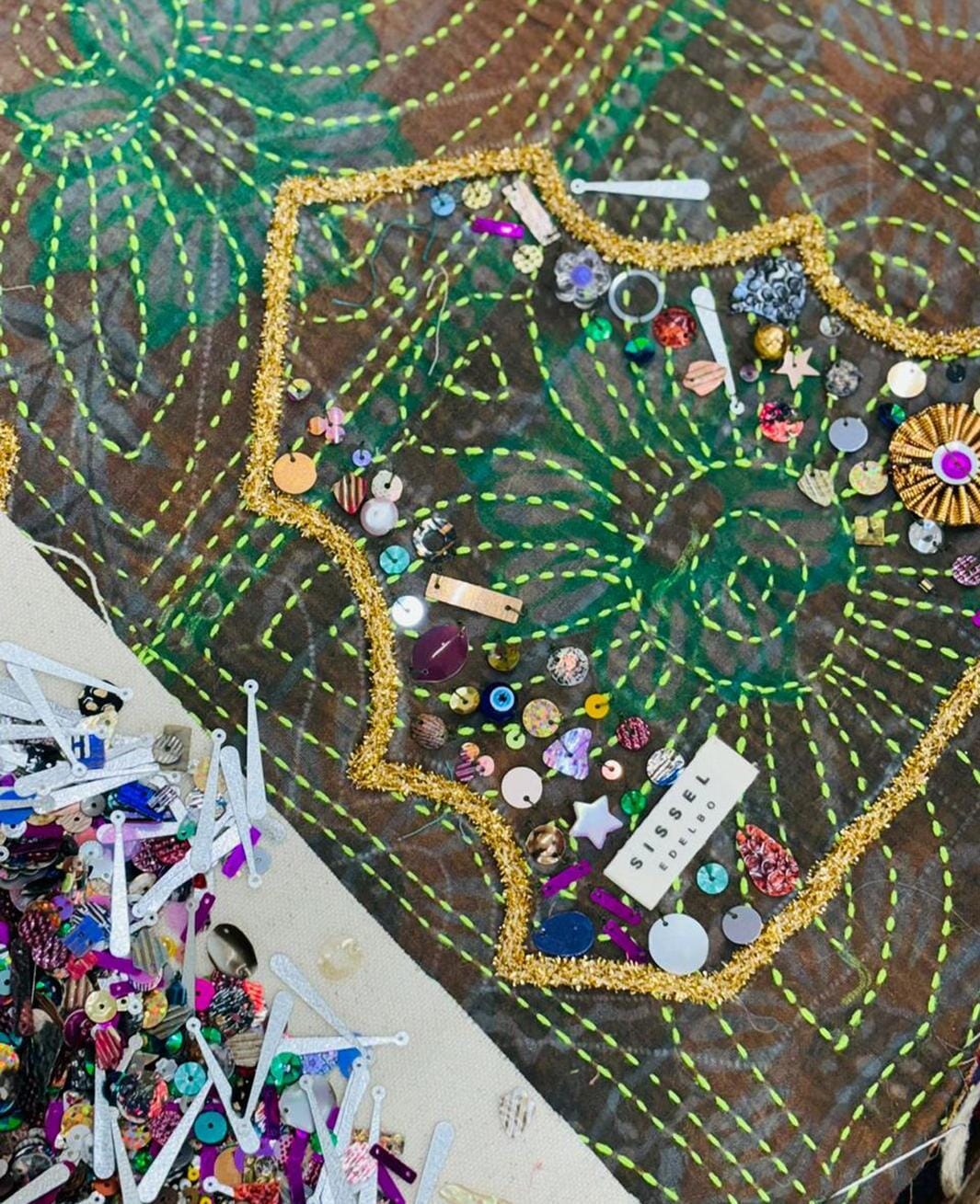 Dekorativer Weihnachtsbaum von Sissel Edelbo, hergestellt aus Resten von Vintage-Kantha-Decken. Der Baum ist grün mit goldenen und silbernen Lurex entlang der Kanten und verziert mit Evil Eye-Perlen und Rosetten.
