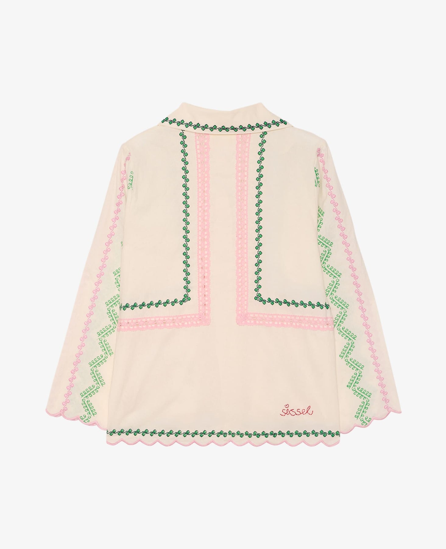 Hemd von Sissel Edelbo in Off-White mit grüner und rosafarbener Blumenstickerei. Das Hemd hat gewellte Spitzenbänder und gewellte Kanten mit Stickerei.