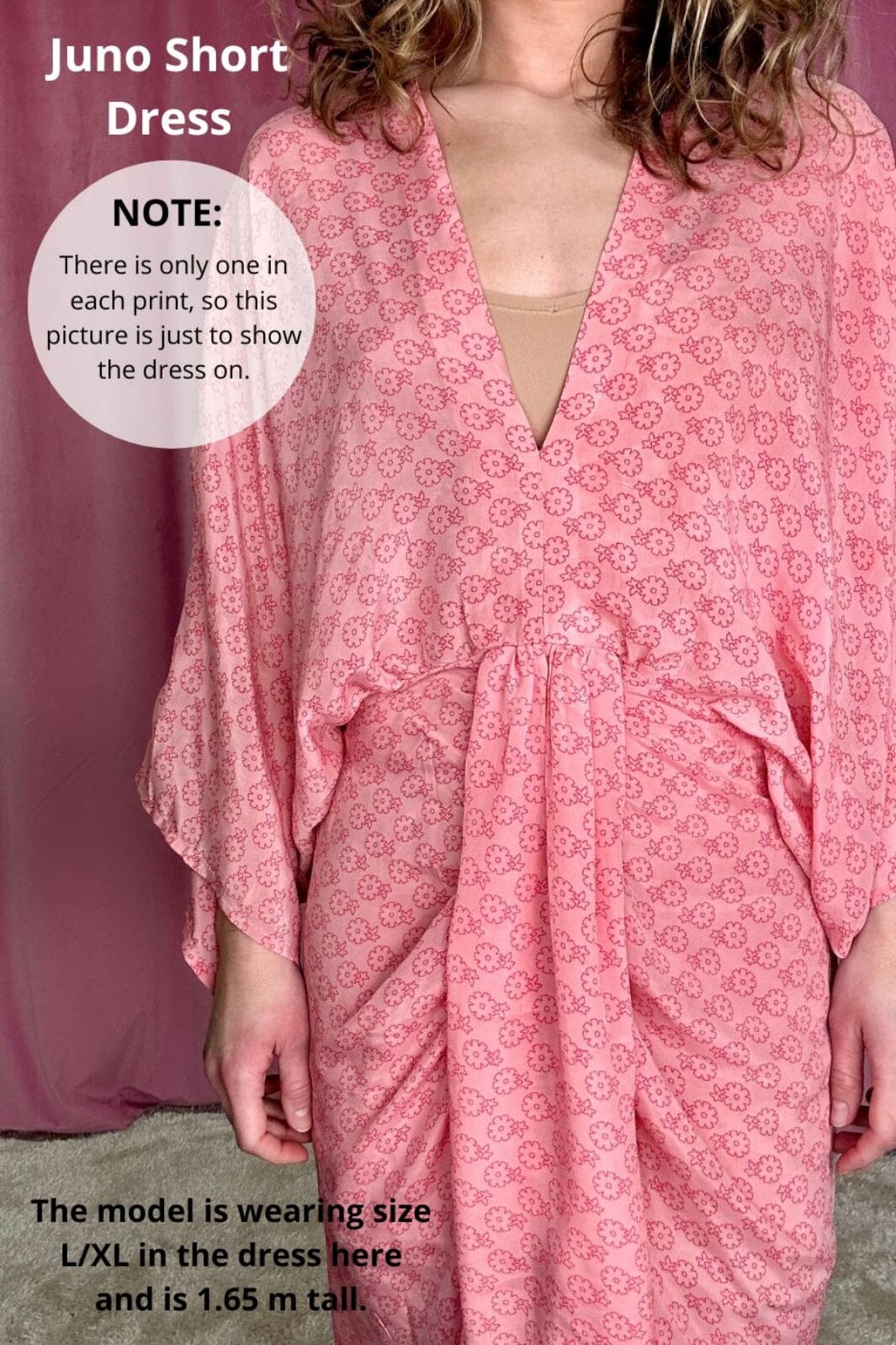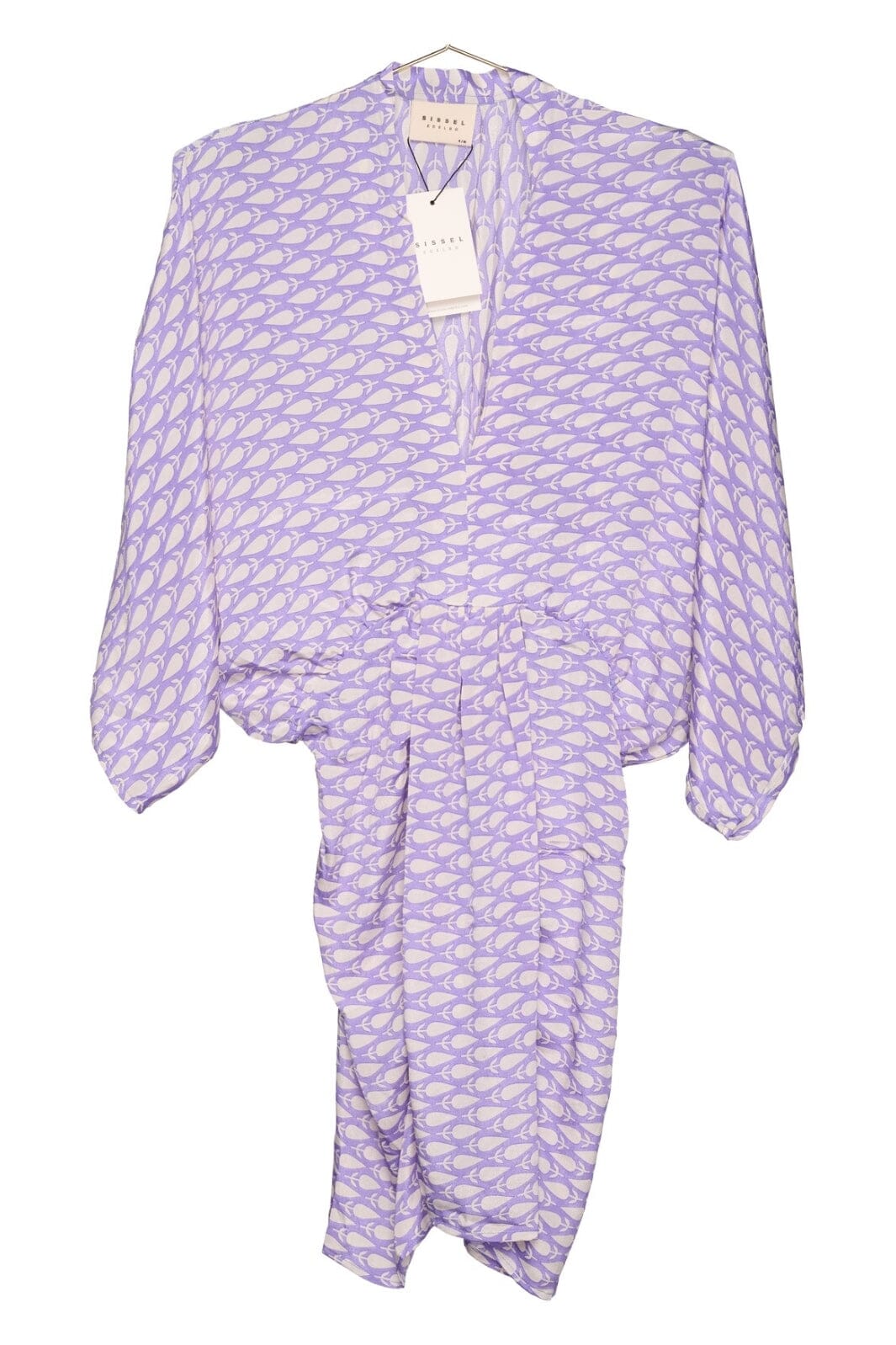 Kurzes Kleid von Sissel Edelbo im lila-weißen Print mit V-Ausschnitt. Das Kleid hat Schmetterlingsärmel und einen elastischen Bund in der Taille, der der Silhouette Form verleiht.