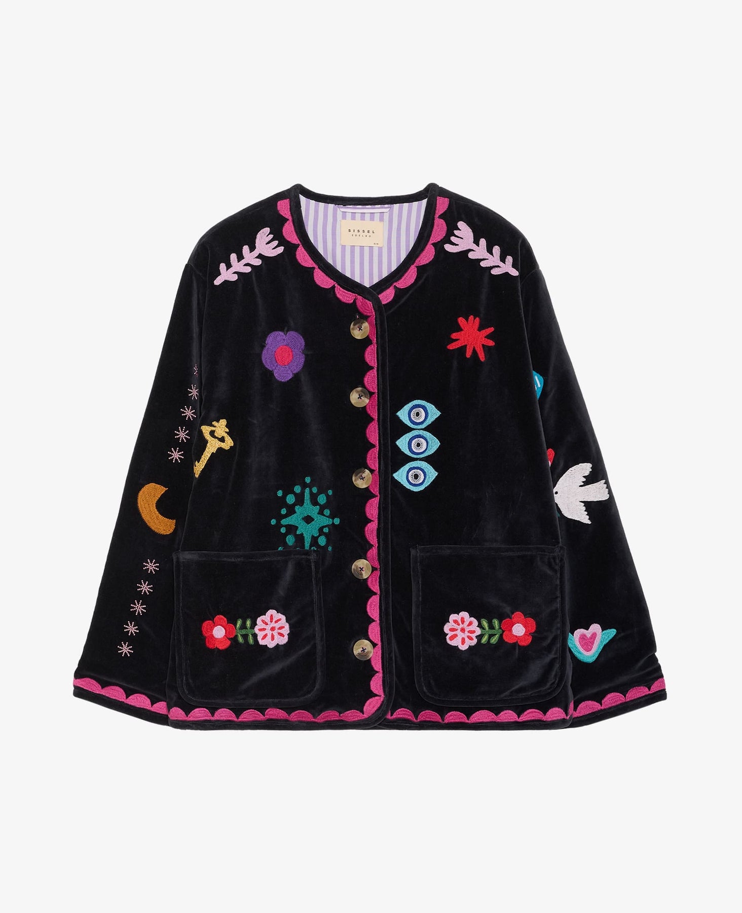 Schwarze Jacke von Sissel Edelbo, gefertigt aus überschüssigem Cord mit farbenfrohen Stickereien. Die Jacke ist mit Tigern, Blumen, einer Schlange und Perlen verziert.