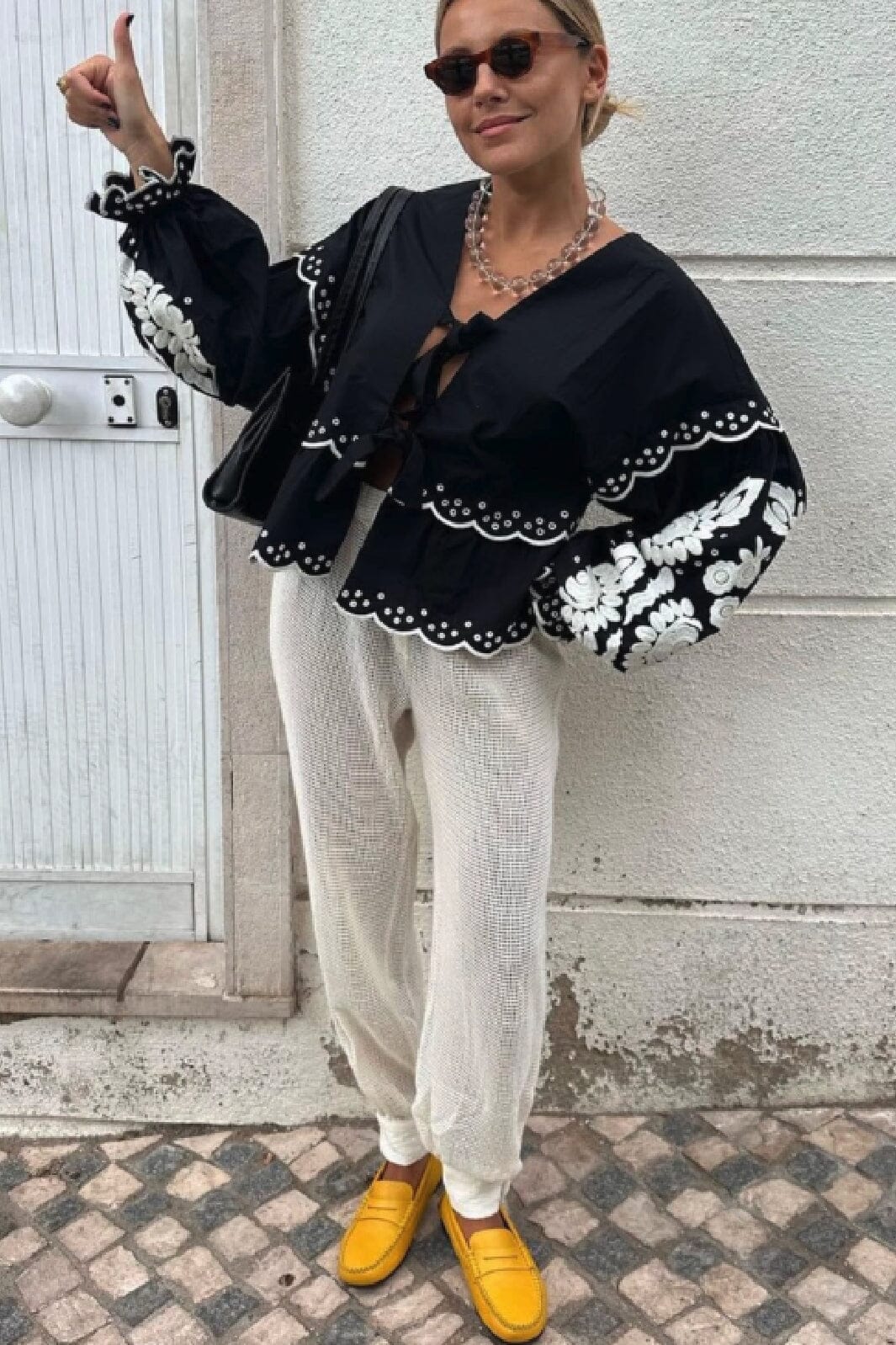 Schwarzes Top aus Bio-Baumwollpopeline mit weißen Schwänen. Das Top hat einen V-Ausschnitt und lange Ballonärmel mit gestickten Details entlang der Kanten und auf den Ärmeln.