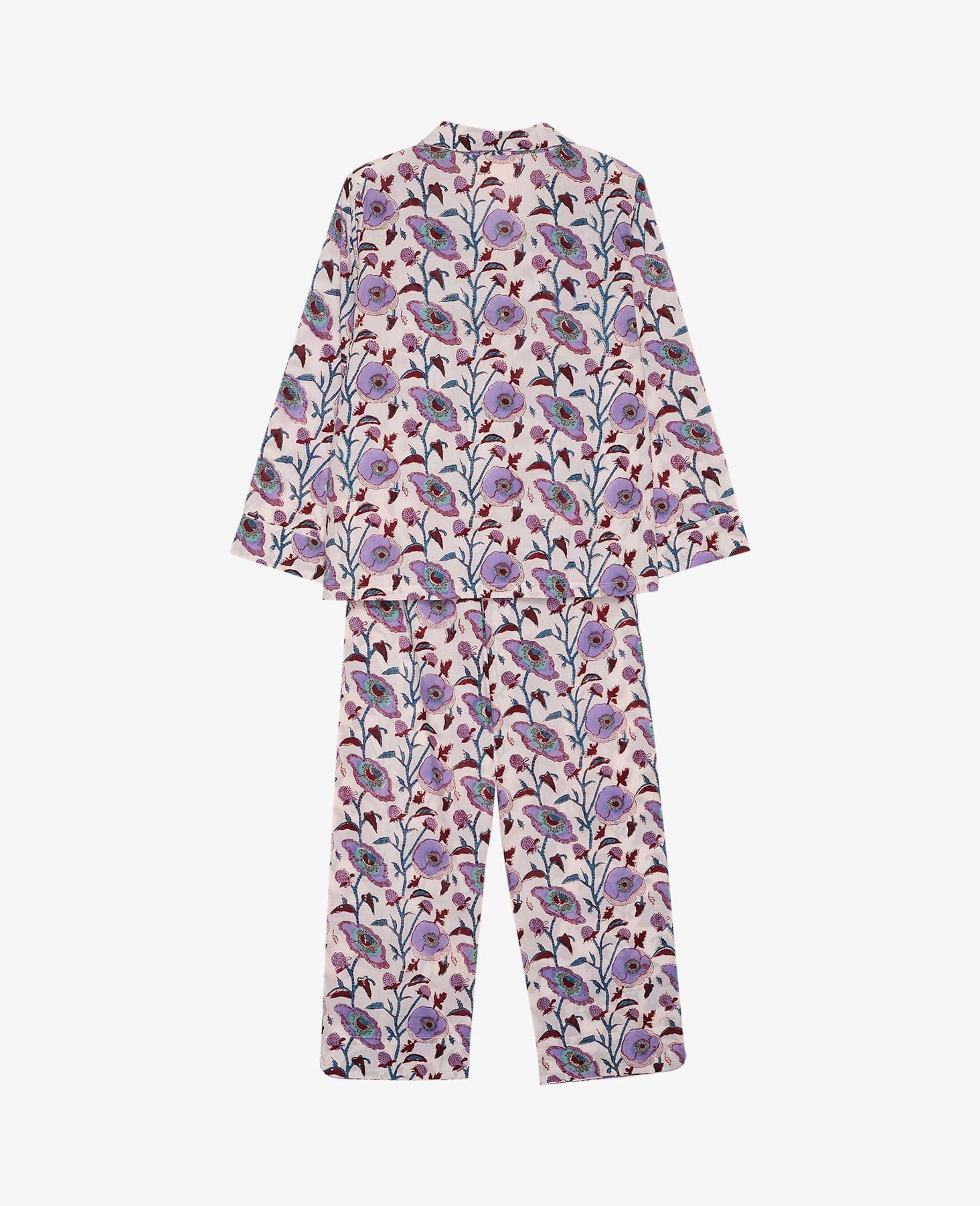 Pyjama-Set von Sissel Edelbo mit lila Blumenmuster. Das Set besteht aus 100 % Bio-Baumwolle und ist mit traditionellen indischen Blockdrucken verziert.