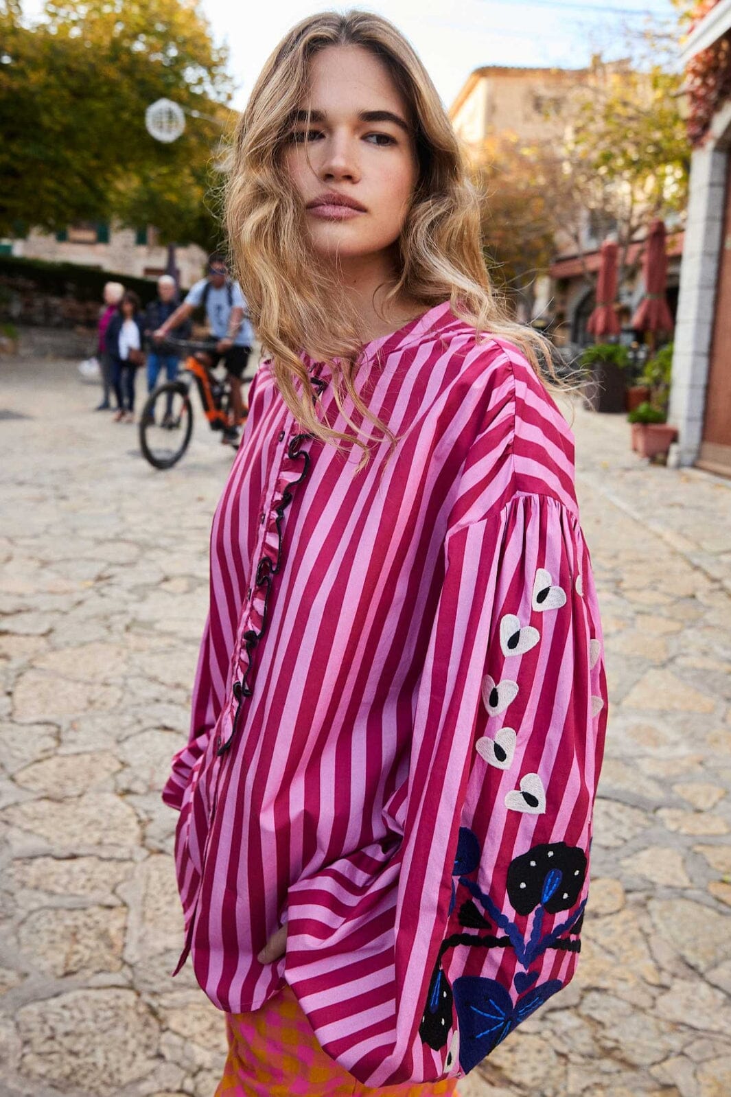 Rosa gestreifte Bluse von Sissel Edelbo aus Bio-Baumwoll-Popeline. Die Bluse hat Blumenstickerei an den Ärmeln und eine geraffte Vorderseite mit Knöpfen und Hemdkragen.