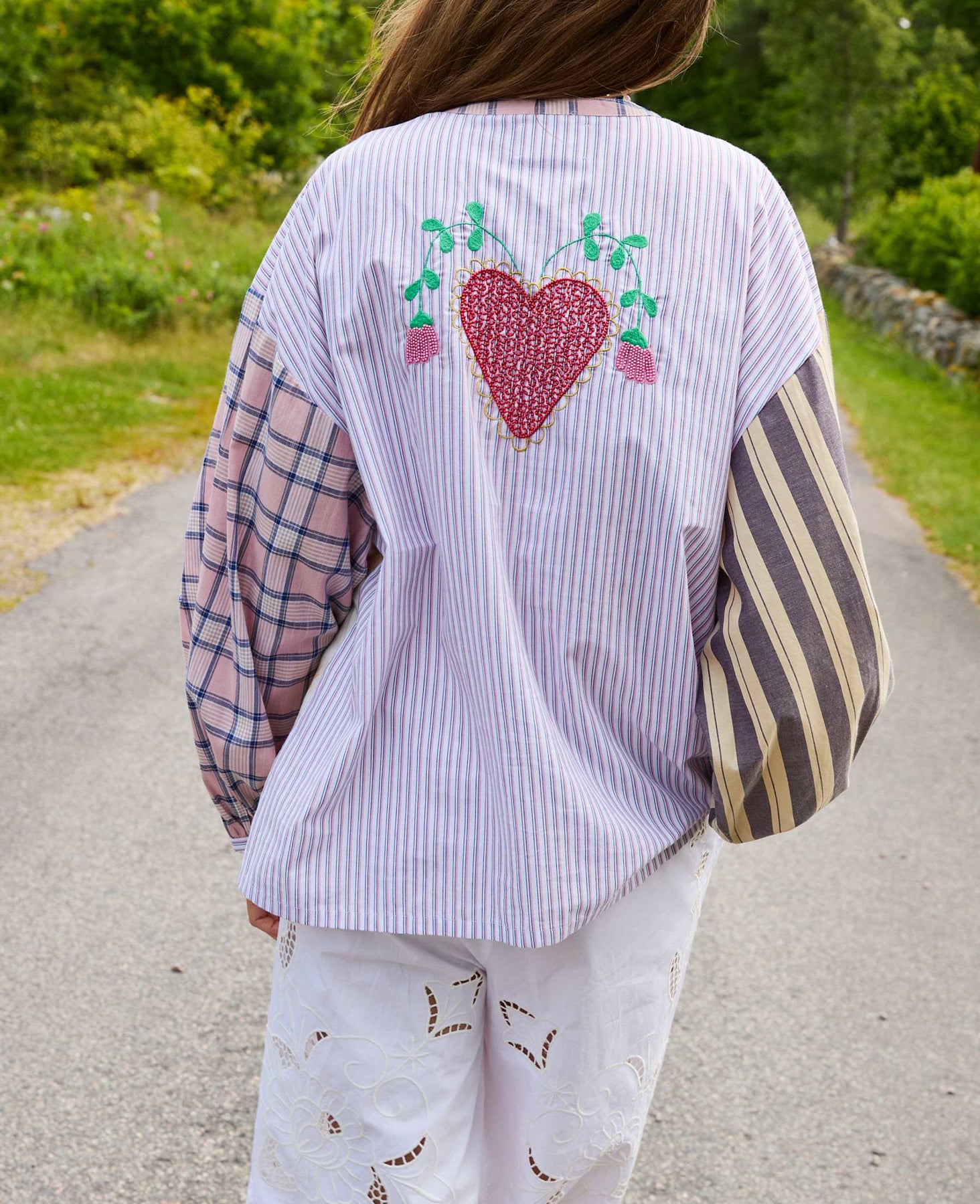 Hemd von Sissel Edelbo mit einem mehrfarbigen Patchwork-Design aus Karos, Streifen und Blumenprint. Das Hemd hat Perlmuttknöpfe und ein gesticktes Herz auf der Rückseite.