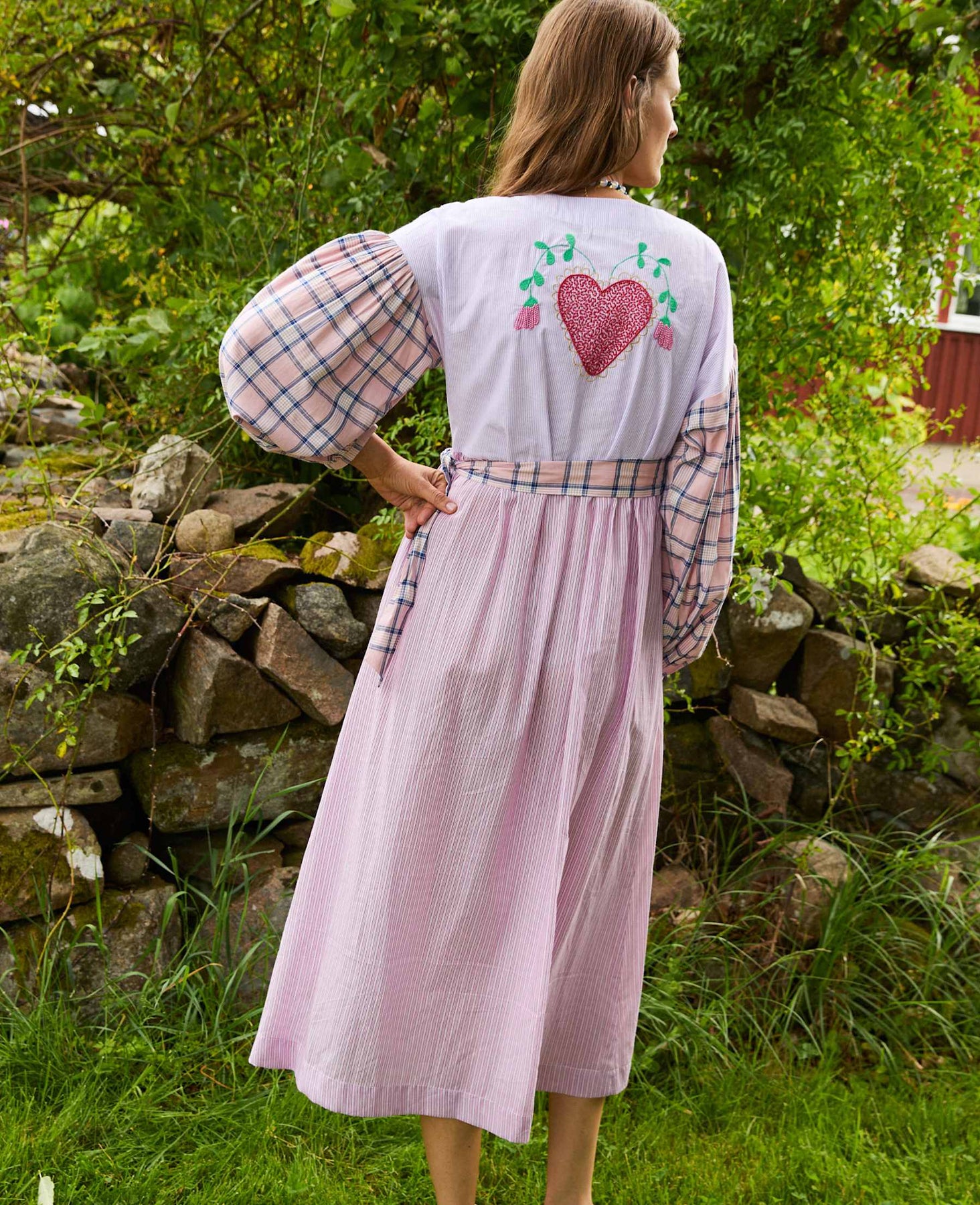 Ein Wickelkleid von Sissel Edelbo mit einem mehrfarbigen Design in kariertem und gestreiftem Muster. Das Kleid besteht aus überschüssiger Baumwolle und Deadstock-Stoffen.