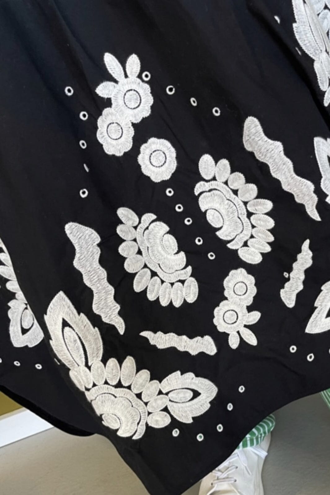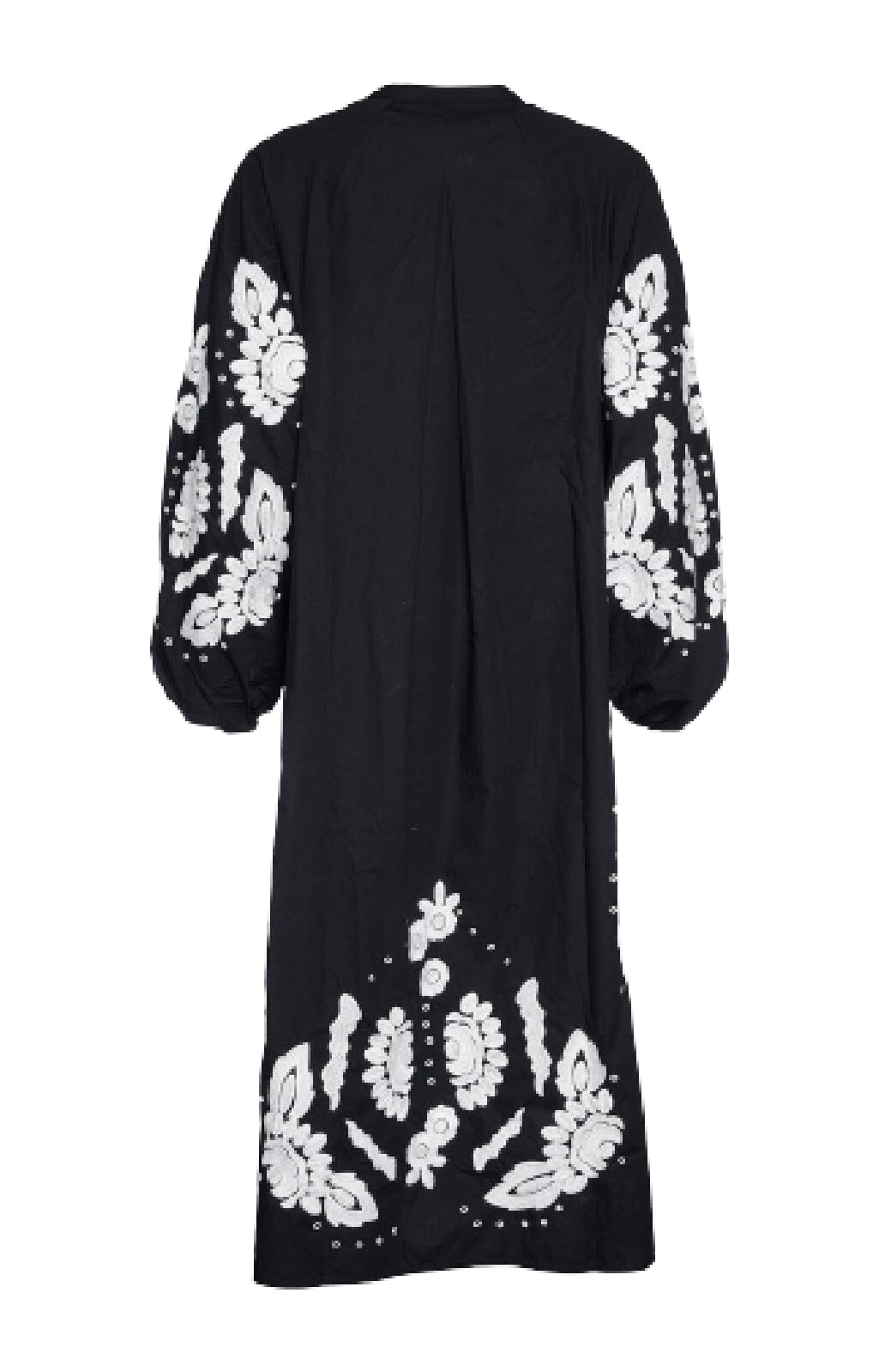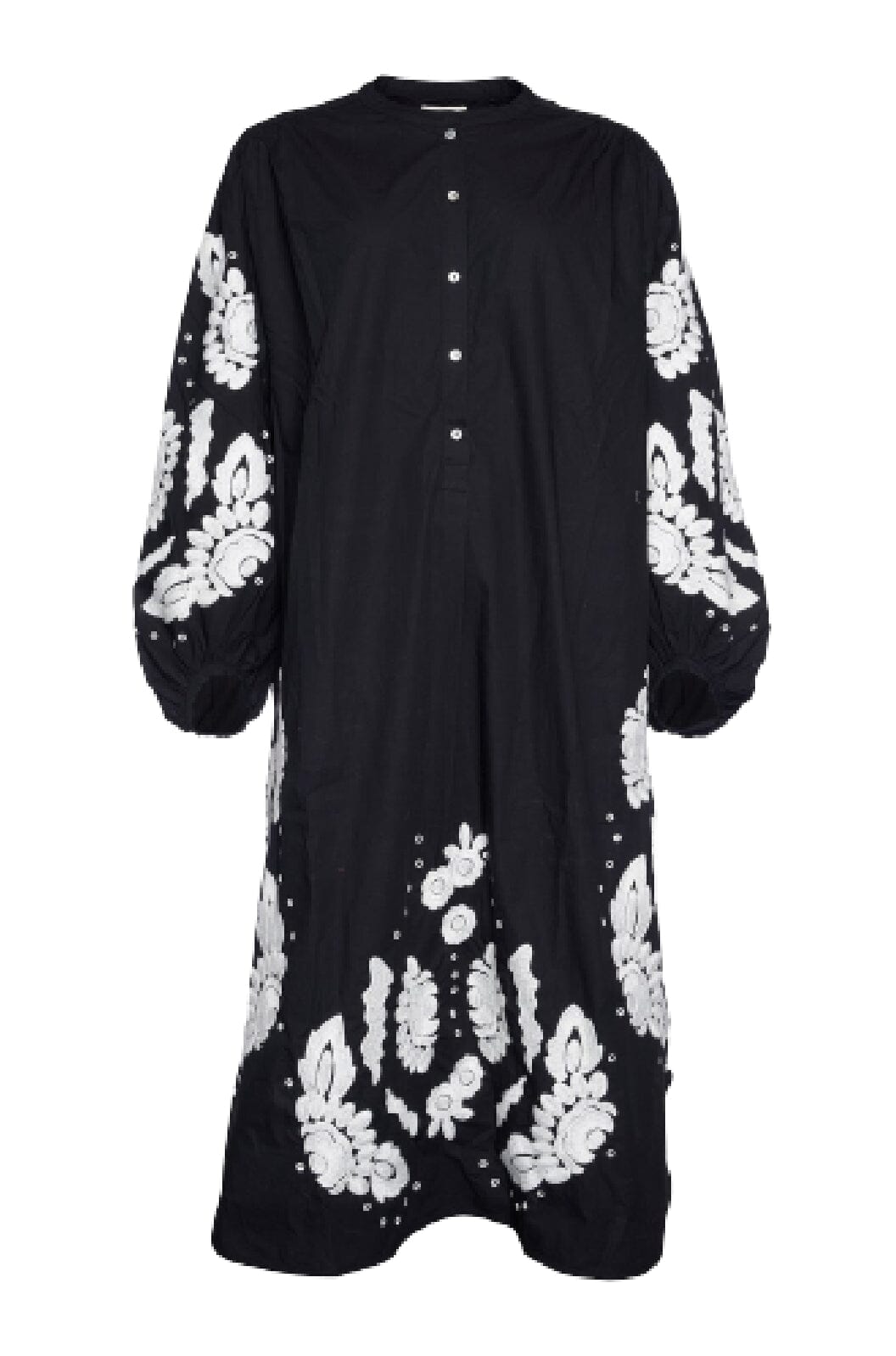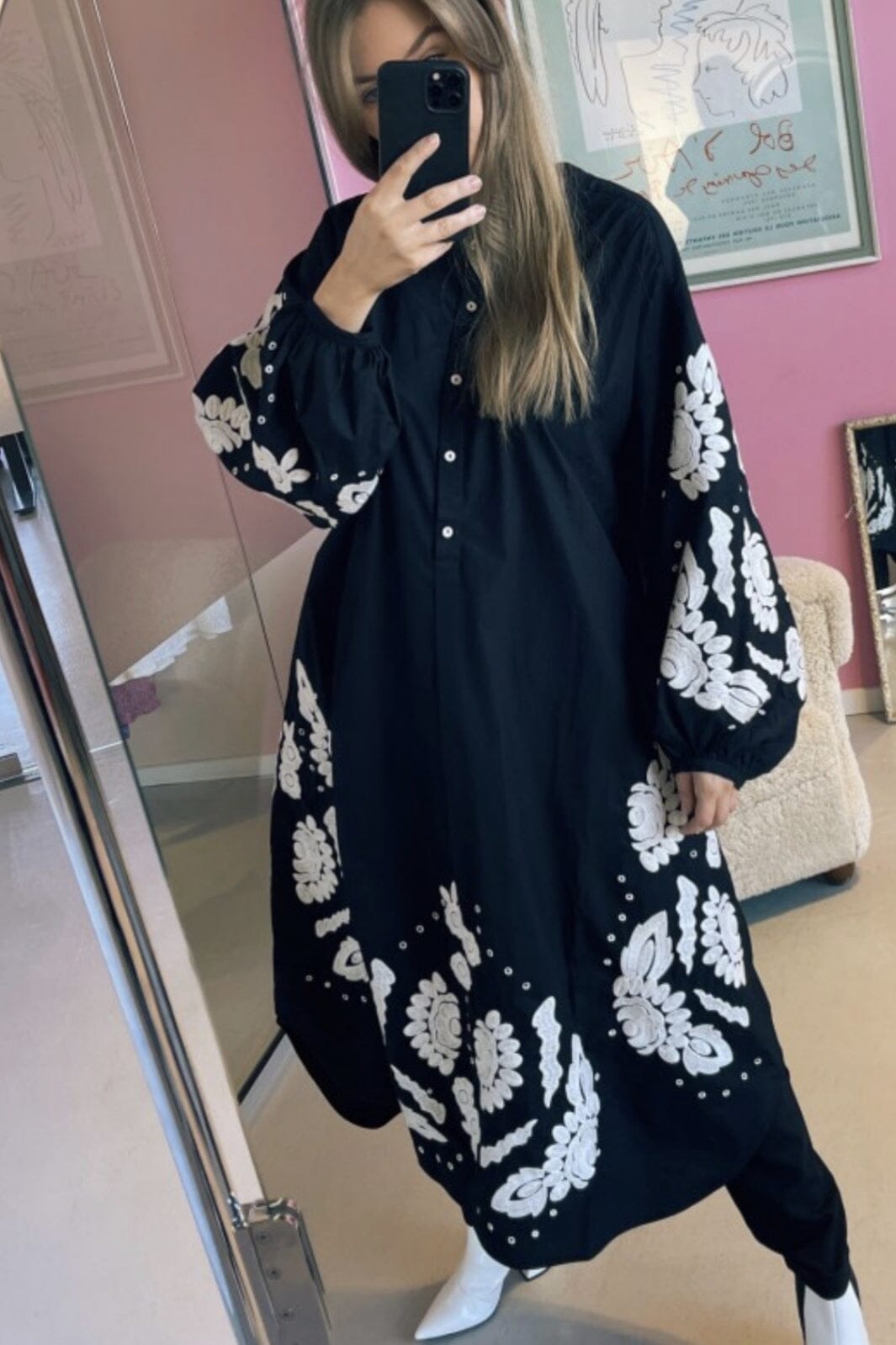 Schwarzes Kleid mit weißer Stickerei. Die großen Puffärmel und Perlmuttknöpfe verleihen dem Kleid einen markanten Ausdruck. Die Stickerei ziert sowohl die Ärmel als auch den Saum.