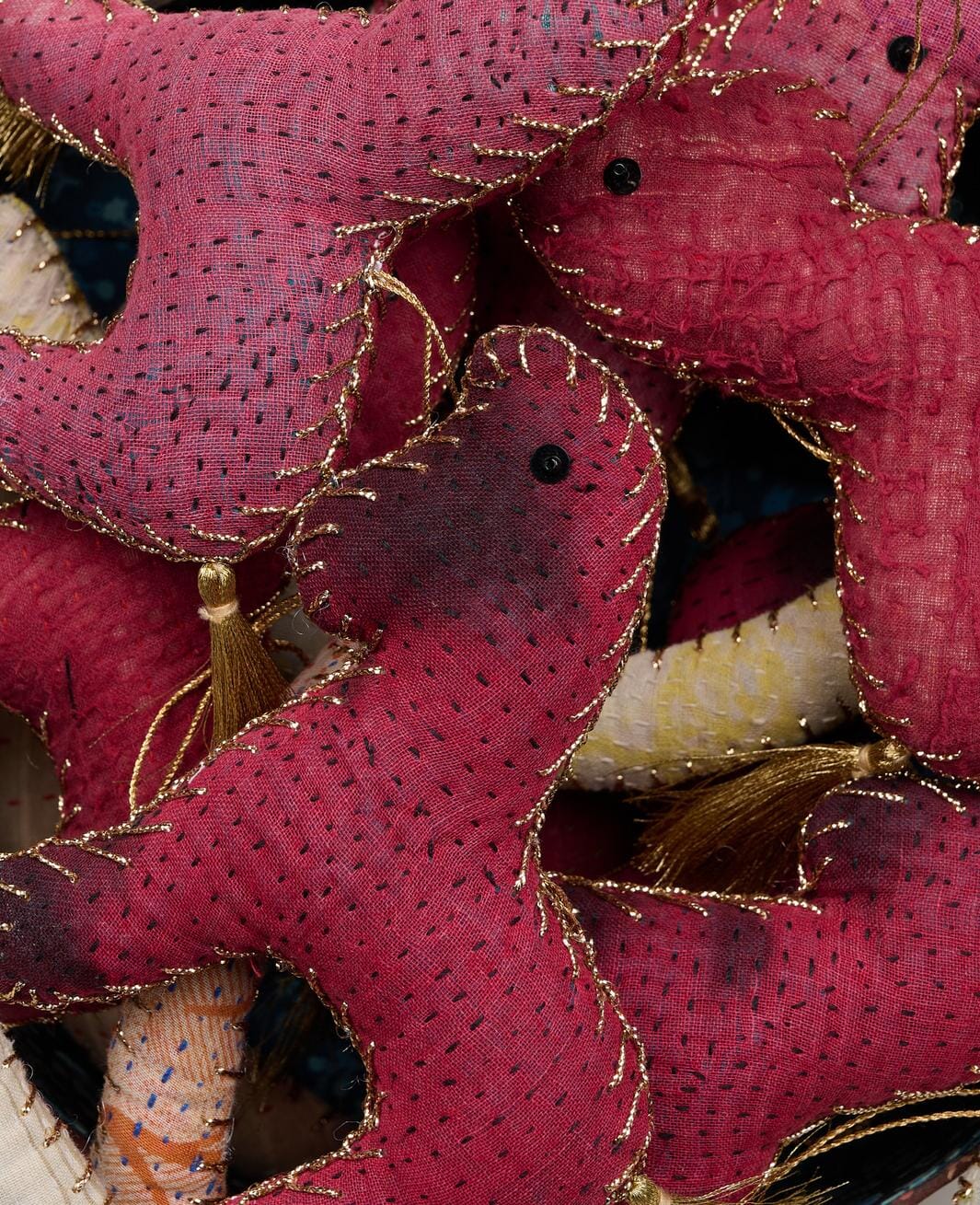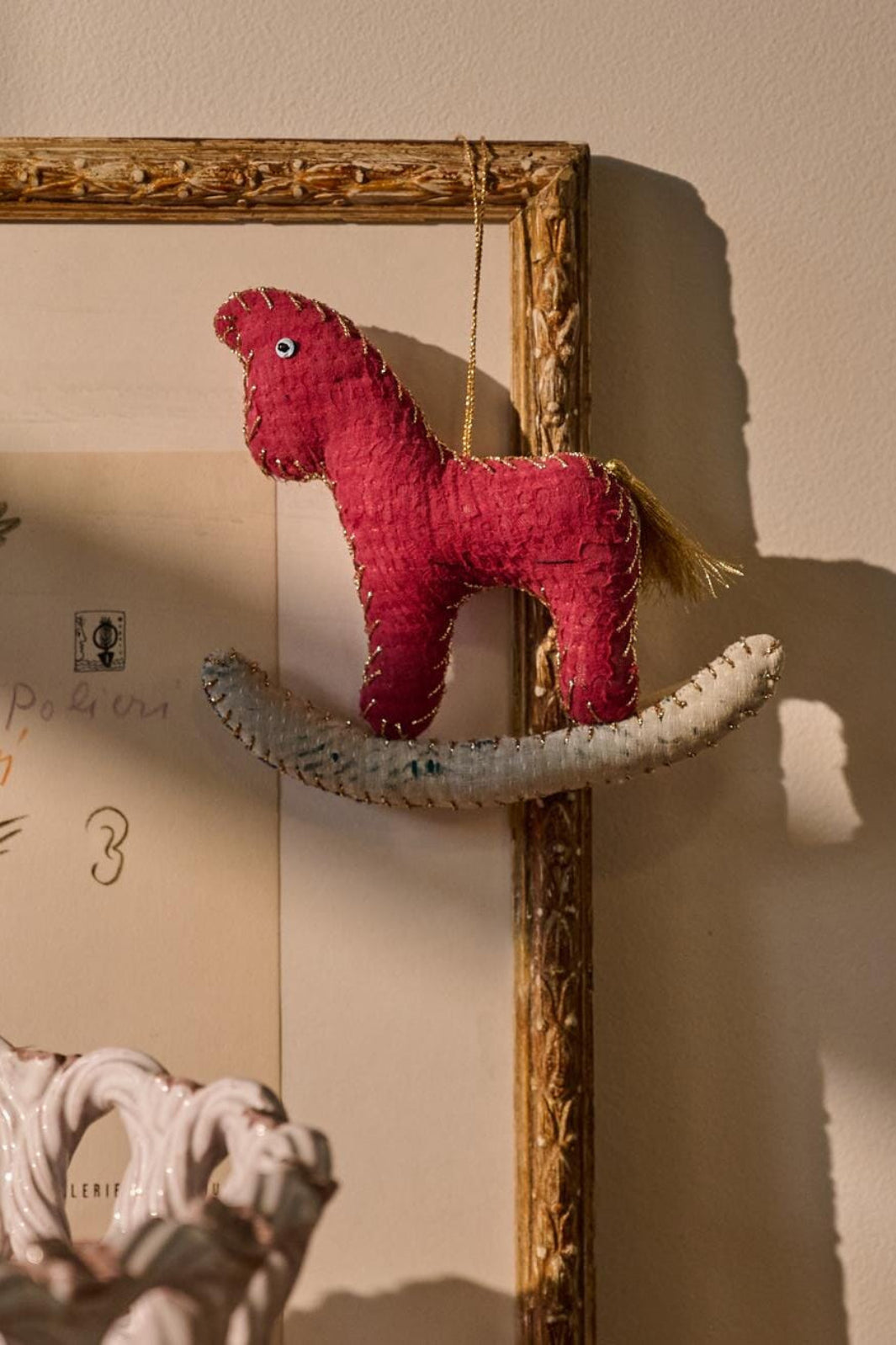 Schaukelpferd-Ornament von Sissel Edelbo, hergestellt aus Resten von Kantha-Decken. Das Ornament hat eine rote und dunkelrote Farbe mit einer weißen, gebogenen Basis und einer goldenen Aufhängeschnur.